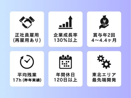 休日休暇 | 休日 ・年間休日120日以上 (正確な休日数は担当頂くプロジェクトにより異なりますが、どのプロジェクトも120日以上の休日がございます。) ・完全週休2日制 ・祝日 ・夏季休暇(今年度実績:6日間*計画年休含む) ・年末年始休暇(今年度実績:6日間) ・慶弔休暇 ・有給休暇 ・産休育休・介護休暇(取得実績多数あり) |