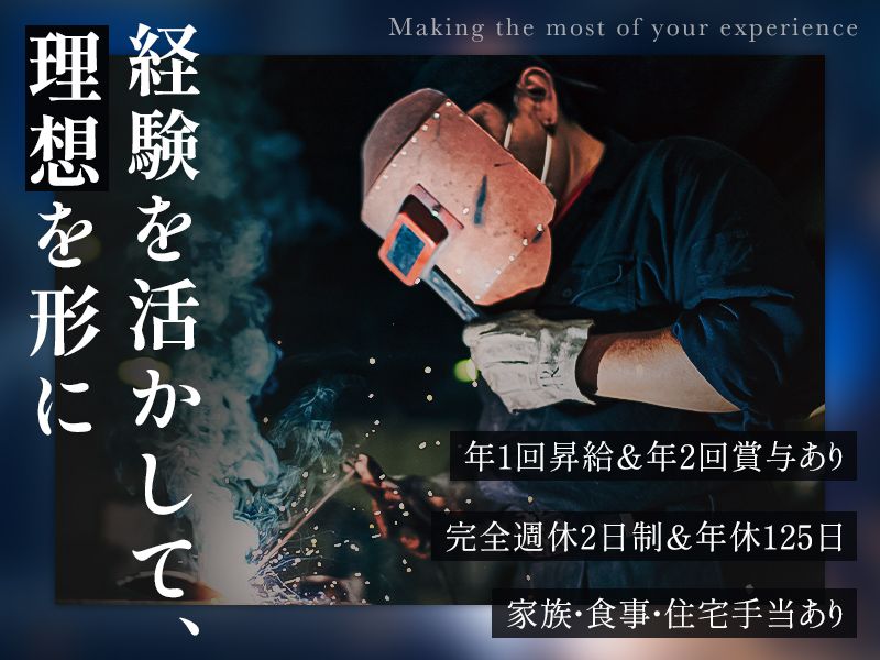 対象となる方 | 必要資格・経験 《必須》 ・鉄工関係の業務の実務経験(3年以上) 《歓迎》 ・普通自動車免許(AT限定可) ・鉄工関係の業務の実務経験(10年以上) 《Point》 *学歴不問 |