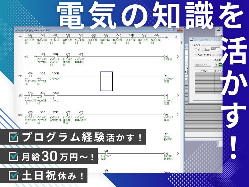 対象となる方 | 必要資格・経験 <必須> ・普通自動車免許(AT限定可) ・プログラミングの経験者 (SEやITエンジニアなどの経験も可) ・工場関連のPLCやシーケンサーの業務経験者 ・情報処理技術者 <POINT> 未経験者歓迎 20・30代活躍中 |