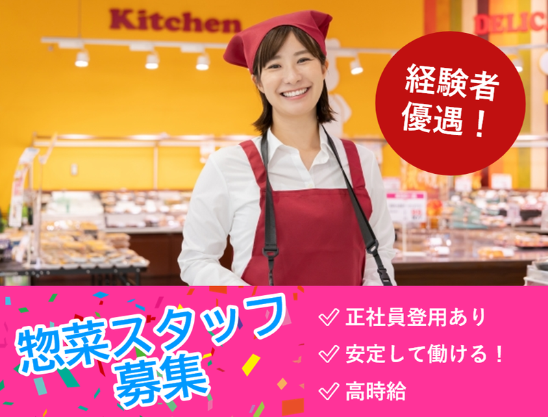対象となる方 | 求めている人材 総菜部門でこれまでの経験を活かして働きたい方を募集します。 惣菜調理の経験がある方はもちろん、飲食店やキッチンでの調理経験がある方も歓迎です。 【必須条件】 〇 惣菜調理、または飲食店・キッチンでの調理経験がある方(経験年数不問) 〇 土日どちらか勤務できる方 〇 チームで協力して働ける方 〇 県内の他店舗への転勤にも柔軟に対応できる方 〇 将来的に正社員登用を目指したい方 派遣期間中も、派遣先で正社員登用の実績があります。 これまでの調理経験を活かしつつ、少しずつ業務に慣れながら長く働ける環境です。 |