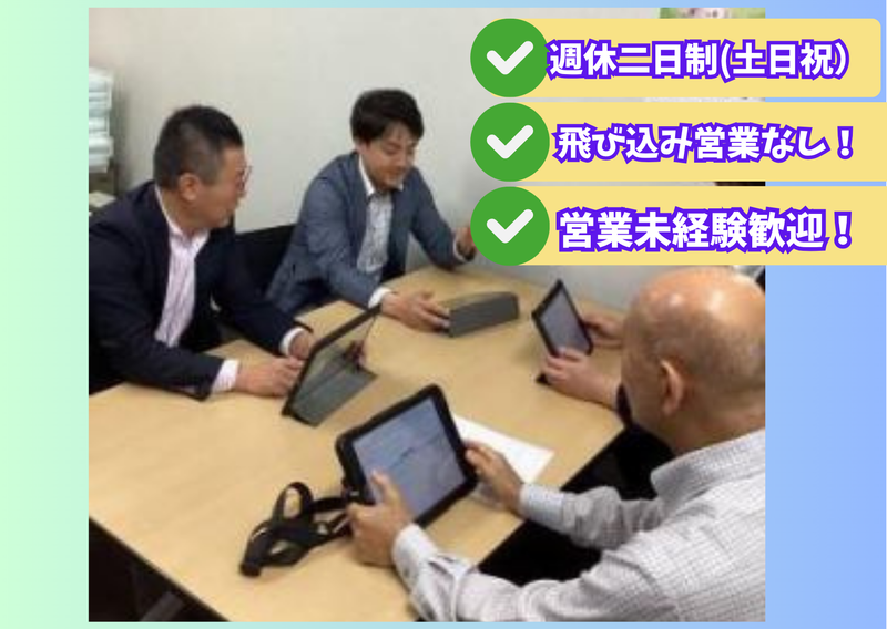 待遇・福利厚生 | 【保険制度】 雇用保険、労災保険、健康保険、厚生年金 【福利厚生】 待遇・福利厚生 【福利厚生】 ◇昇給有(個人の成績による) ◇賞与年4回(個人の実績による) ◇社会保険完備 ◇交通費規定支給 (公共交通機関:月10万円迄/ 車:月2万4400円迄) ◇社用車貸与 ◇iPad・携帯電話貸与 ◇退職金制度あり(勤続1年以上) ◇各種報奨金制度 ◇体験入社制度あり ※希望者のみ (5日間、1日8200円支給) |