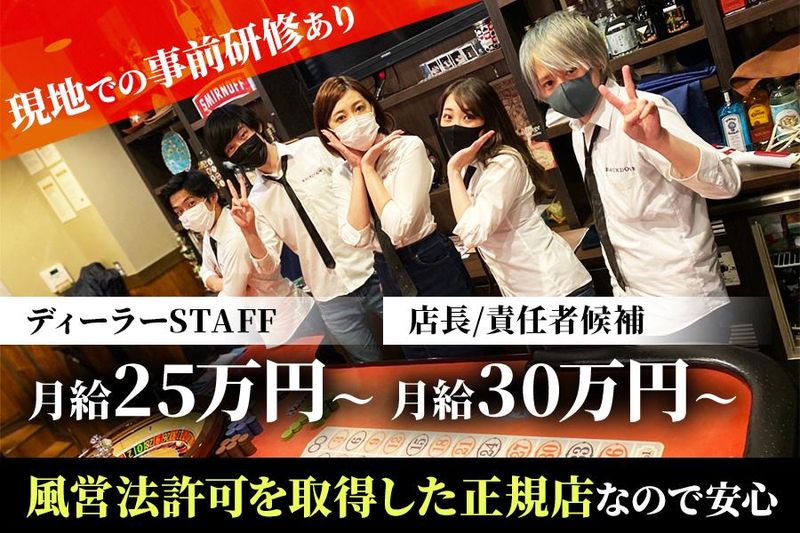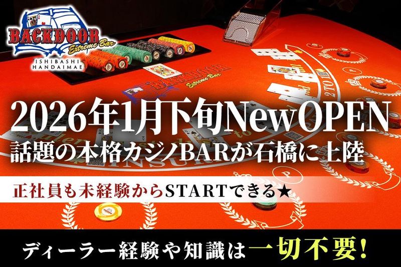 職種/仕事内容 | 仕事内容 \未経験からカジノディーラーとしてデビューしよう!/ 話題のアミューズメントカジノバーが石橋にNew Open! お任せするのは、 世の中的にも注目度が上がっている カジノリーディングのお仕事です! 手厚い事前研修があるので 全くの未経験からスタートできます♪ ポーカーの知識や カジノリーディング経験のない方でも安心! <具体的には…> *カジノゲームの進行 *カジノゲームに携わる全般業務 *接客全般 *お店の運営全般 をお願いします! 将来的には店長候補/責任者候補としてキャリアアップも目指せます! *スタッフ教育 *採用面接 *イベント企画 などもお任せしていきます! 個性を活かせるアミューズメントカジノで楽しく働こう! メディアでも今注目のアミューズメントカジノ! 「一風変わった仕事がしたい」 「正社員として働きたい」 「友達に自慢できるお店で働きたい」 そんな方にピッタリです♪ 今世間的にも注目度が上がっているアミューズメントカジノ業界! そんな成長している業界で手に職付けられるチャンス! 業界内をリードする「BACKDOOR」ならではの手厚い教育を受けられます◎ カジノディーラーとしてキャリアを積めば、 日本にカジノができた時に活躍できたり、 アジアの大会でディーラーしたり、 ラスベガスの大会に挑戦したりなんて、 こんな将来像もあるかもしれません♪ ■オープニングだから空きポスト多数! 今回の募集は新規出店に伴うオープニング募集! つまり…ポストはまだ空席だらけ! あなたのやる気・努力がそのまま評価に直結し、 早期にリーダーや店長へ抜擢される可能性も◎ 個性や挑戦を歓迎する風土だから、 他業種からの転職でものびのび活躍できます! ■本店・六本木での充実研修で安心スタート♪ 初めての方でも安心してスタートできる理由は、 本店”六本木”での現地研修! 現場で活躍する先輩たちが直接指導を受けられます! もちろん研修に伴う費用は会社が負担します! ゲーム進行から接客マナーまで一流のスキルを 学んでからお仕事デビューできるから 自信を持って現場に立てます! ■髪型・髪色自由!ネイル・ピアスもOK 「仕事のためにオシャレを諦めたくない!」 そんなアナタも朗報◎ 髪型・髪色、ネイル・ピアスまでALL自由だから 好きなオシャレしたまま働けます! ■週休2日でプライベートと両立OK 週休2日のシフト制なので、働きやすい環境です。 営業時間も長くないので、 プライベートや趣味との両立もしやすい環境です! |