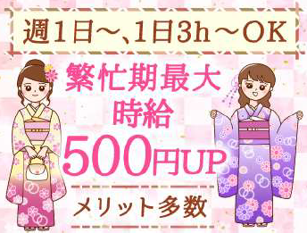 職種/仕事内容 | 仕事内容 着付け師 お客様の着物の着付けをお任せします。1300~ 美容師 ヘアアレンジでる方、メイクできる方 1300~ 受付: お客様の受け付け対応、留学生大歓迎!未経験OK 1150~ *上記の他、受付・清掃・洗濯などみんなで手分けして行います。 ★GWなどの繁忙期は時給300~500円アップします! ★外国語が活かせる職場♪ ★「ヘアアレンジをするのが好き」「着物が好き」という方大歓迎です◎ ★お客様は10代~30代が9割。 |