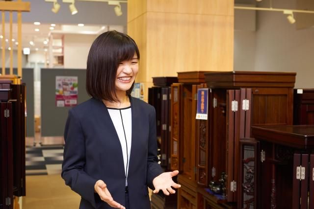 職種/仕事内容 | 募集要項 職種 仏壇・仏具の接客販売スタッフ 雇用形態 正社員 仕事内容 まずは、仏壇・仏具の基本的なマニュアルや先輩から指導を受け、 先輩の接客を見てじっくり身につけていきます。 少しずつ接客を増やし、宗派やご予算等に応じ商品案内と販売迄をお願いします。 ★在庫管理・書類の作成などのPC作業あり。 ▼お客様から受ける質問は ・宗教によるお仏壇種類・平均価格・お位牌 ・仏壇の置き場所・お手入れ方法など ▼ヤリガイとして 仏事や作法により多数の商品をご用意。知れば知るほど日本の伝統、しきたりといった奥深さを実感いただけます。 ▼お客様との会話のコツは? お客様の平均単価は15万円程。「何か御用がありましたらお声掛けください」と声をかけ、店内をゆっくり見ていただきます。気になった仏壇等で質問があったらお応えしていくスタンスです。安心感を持っていただける事がポイントです。 |