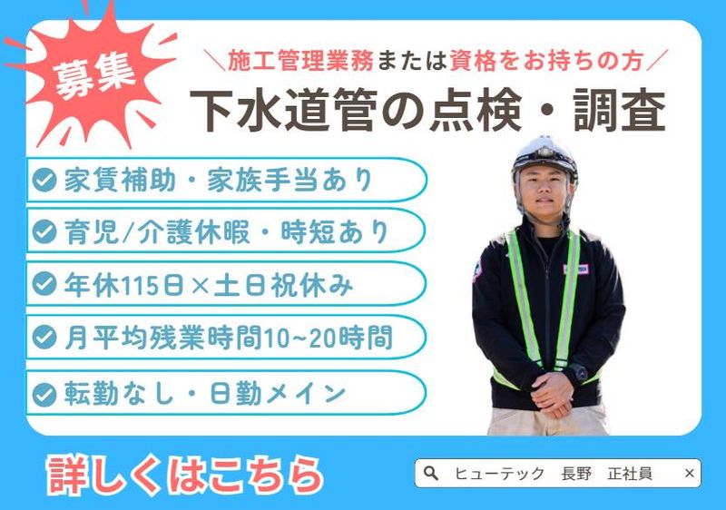職種/仕事内容 | 仕事内容 土木施工管理の資格 or 経験をお持ちの方 ※募集の業務経験をされた方も可 ◤ ̄ ̄ ̄ ̄ ̄ ̄ ̄ ̄ ̄ ̄ ̄ ̄ ̄ ̄ ̄ ̄◥ 下水道管 維持管理のための 日常点検・調査をお任せ! ◣________________◢ ………⭐おすすめPOINT⭐……… ✅経験年数・保有資格に応じて処遇は 決定します!ご相談ください。 ✅年休115日×土日祝休み ✅原則日勤でワークライフバランス◎ ✅月平均残業時間10~20時間 ✅家賃補助・寮社宅補助あり! ✅家族手当・育休・育児時短制度◎ ✅介護休暇・介護時短制度◎ ✅転勤なし◎地域に根差したお仕事 ✅資格取得支援制度あり ✅待遇・手当など充実 └詳細は“福利厚生”欄をcheck! ⭐仕事内容⭐  ̄ ̄ ̄ ̄ ̄ ̄ ̄ ̄ ̄ ̄ ̄ ̄ ̄ ̄ ̄ ̄ ̄ 公共インフラである下水道管の 維持・管理のため、 目視・その他適切な方法により 定期的な日常点検・調査を行います。 ⏩具体的には ……………………………………… ✅調査専用車両を使った点検 └地下にある下水道管を 自走式カメラで調査 ✅工場や宅地内の排水管調査 └専用機材を使って状態を確認 ✅下水道管などの点検 └老朽化や損傷がないかチェック ✅報告書作成業務 └システムを使用するため 専門知識は不要です! ╭━━━━━━━━━━━━━━━╮ \✨安心の教育体制✨/ ╰━━━━v━━━━━━━━━━╯ 最初は4~6名のチームで 業務を実施します! 環境に慣れるため、3ヶ月程度は 補助業務を担当しながら 機械操作などを覚えていきましょう。 その後、1年程度で小規模な 業務をお任せしていきます。 <✨ サポート体制について> ・・・・・・・・・・・・・・・・・・・・・・・・・・・・・*・・・ 基本的には課長や、その業務の 責任者が指導を行います。 もちろん、同じチームの先輩も 頼れるのでご安心ください♪ ぜひ、色んな先輩たちから スキルを吸収していってください。 また、キャリア形成に必要な 資格取得も応援します! 補助金や報奨金などでバックアップ◎ 長く安定して働けるスキルや 環境の提供をしています。 ╭━━━━━━━━━━━━━━━━╮ \✨長く働ける環境を整えています✨/ ╰━━━━v━━━━━━━━━━━╯ ☆ 努力や成長をしっかりと評価 └仕事や資格取得を頑張る意欲がUP! ☆ 個々のやり方や性格を尊重 └何事にも挑戦できる環境! ☆ 伸び伸びと仕事ができる職場 └様々な経験を積むことができます! |