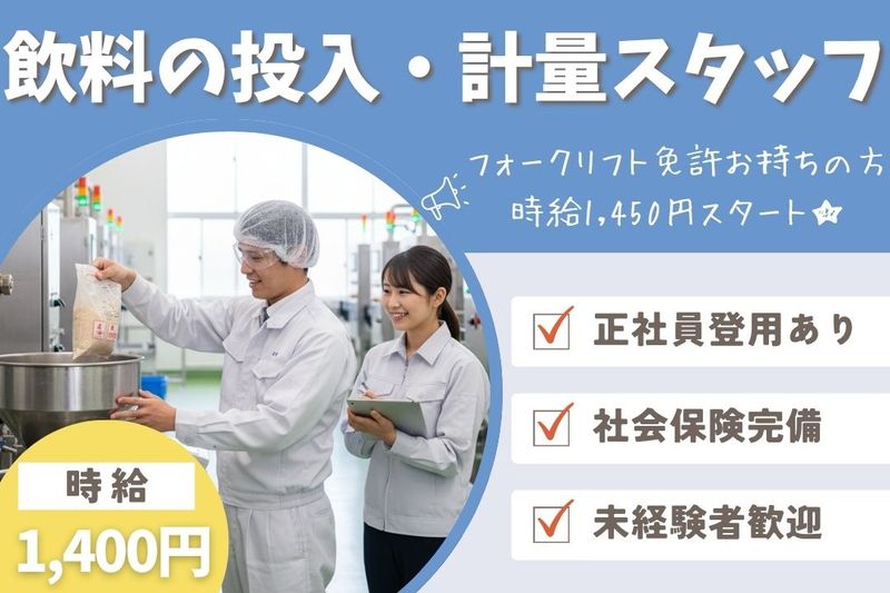 職種/仕事内容 | 仕事の内容 \✨未経験OK!飲料工場で投入・計量スタッフ✨/ 「社員を目指したい」「自分らしく働きたい」そんなあなたを応援! 充実の待遇で、安定したキャリアを築けます。 【具体的な業務内容】 ・飲料水の製造工場での原料投入・計量業務 【✨ココが魅力!✨】 ✅ 社員登用あり!安定したキャリアを築ける ✅ 車・バイク通勤OK!快適な通勤環境 ✅ 交通費支給!通勤負担ゼロ ✅ 給与前払いOK!すぐにお金GET ✅ 即日・週払いOKで安心 ✅ 昇給あり!頑張りが評価される ✅ 髪型・髪色自由!自分らしく働ける ✅ 食堂あり(1食200円~) ✅ 自動販売機・レンジ・冷蔵庫・ロッカー完備 ✅ 社会保険完備 ✅ 時給1400円スタート!フォークリフト免許お持ちの方は時給1,450円スタートです。 【こんな方におすすめ】 ・未経験から製造業に挑戦したい方 ・安定した企業で長期的に働きたい方 ・自分らしく働きたい方 ・深夜勤務が可能な方(18歳以上) |
