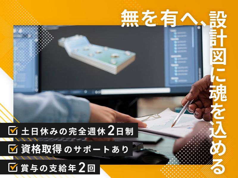 職種/仕事内容 | 仕事内容 \\無を有へ、設計図に魂を込める// ~この求人のPoint~ ✅賞与年2回支給あり ✅うれしい土日休み〇 ✅資格取得支援ありでスキルアップ ✅完全週休2日制でお休み充実 ✅大型連休でリフレッシュ〇 ✅各種手当もご用意! 【おもな業務内容はこちら】 〇2D/3D CADソフトを使用した 図面作成 (組み立て図、詳細な部品図など) 〇専用ソフトを使用した 強度や合理性の検討 〇設備のレイアウト図面作成 〇顧客との打ち合わせ |