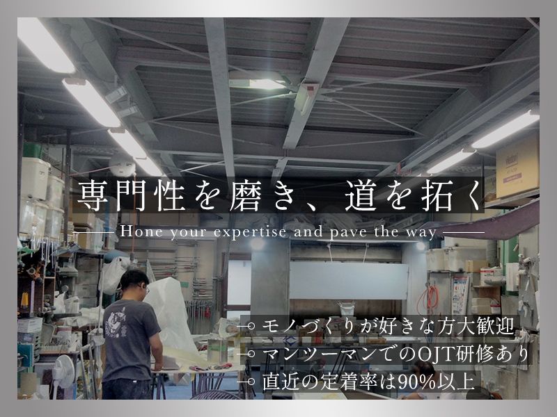 職種/仕事内容 | 仕事内容 ================ 最初は補助業務スタート♪ 専門知識&経験は一切いりません! ものづくりが好きなら大歓迎です! ================ \この求人の魅力/ ✅マンツーマンでのOJT研修あり ✅資格取得支援をサポート! ✅直近5年での定着率は90%以上 ✅正社員登用あり♪ ✅ノルマは一切ナシ \仕事内容はこんな感じ!/ 美術造形品の製作業務全般をお任せ! お客様のご要望に合わせて 多種多様なものをつくります! 【素材】 FRP材、ウレタン材、 発砲材、モルタルなど 【製作物】 ▽メイン 外装の一部、特殊模型 (テーマパークで使う特殊造形品) ▽そのほかも幅広く制作♪ 街角の立体看板、キャラクター人形、 テーマパークの展示レプリカ、 車両の外装など \製作の流れをご紹介!/ 1.モデルとフォームの作成 手描きやCADソフトを使って作成された モデルを基に、発泡スチロールや木材、 粘土などで原寸大のフォーム(型)を製作。 磨き作業や塗料の塗布など、お手本通りに 行っていってください♪ 2.FRPの成形と硬化 製作したフォームの表面に、 FRPが剥がれやすくなるように離型剤を塗布します。 その上にガラス繊維を敷き、 ポリエステル樹脂などのプラスチック樹脂を コーティングしてFRPを形成します。 その後、常温または加熱によって樹脂を硬化させます。 3.仕上げと出荷 硬化が完了したFRP製品をフォームから取り出し、 表面を研磨したり塗装したりして仕上げます。 最後に、完成品を出荷し、 必要に応じて現場での取り付け工事も行います。 【POINT】 ✨仕上げは1作品につき平均1ヶ月ほど ⇒決まった納品日までに仕上げます♪ ✨作品の規模によって作業人数は変動 ⇒複数人または一人で作業を行い、 手が空いた人が順繰りに手伝っていく 流れで、明確な担当者は決まっていません! ✨顧客折衝は基本的になし |