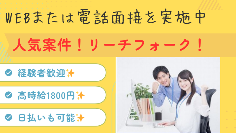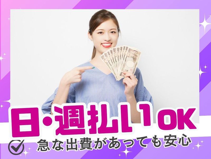 給与 | 時給1,800円以上 給与詳細 基本給:時給 1800円 〜 交通費:当社規定支給 【仮払い制度利用可能】 ・日払い (当日締、翌銀行の営業日払い) ・週払い可 (日曜締、翌銀行の4営業日払い) 【給与例】 給与例 <週5日働いた場合> 時給1800円、週5日、1日8時間で勤務。 月々28万8000円の収入。 (月4週換算で計算した目安金額です) 残業ができるスタッフの方は、月収30万円以上稼いでいます! ※残業は業務状況により発生する場合があります ※残業の有無はご希望でお選びいただけます。 |