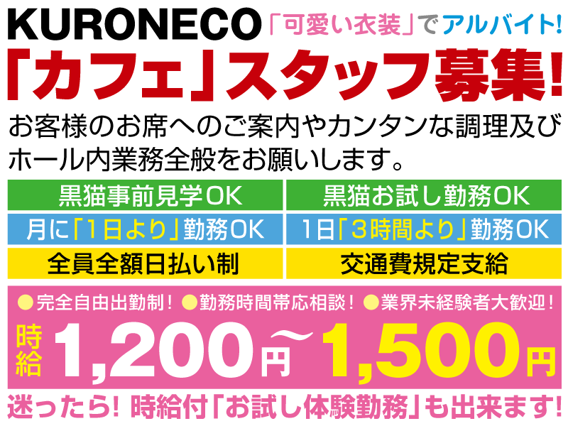 対象となる方 | 求めている人材 人気メイドカフェで非日常空間^^ 完全自由シフト制・月1日、3h~OKで私生活との両立OK!昇給あり◎ KUROKOでは、お客様に「楽しい・可愛い」をご提供する為に、 様々な「テーマカフェ」を運営しています。 黒猫メイド魔法カフェは、コミュニティを大切にした ご主人さま達の憩いのカフェ。 いつもご主人さまの気持ちを大切に、 優しく楽しくお出迎えしてくださる 新しいスタッフの方を募集いたします! アピールポイント \だれでも活躍中/ 勤務時間が自由なので、ご自身の都合に合わせて働けます! まずは笑顔をご用意ください^^ どなたでもお待ちしています◎ \昇給あり/ 経験・年齢を問わず実務能力に応じて決定。 あなたの頑張りをしっかり見ています! \毎日お給料日/ 日払い制だから、毎日お小遣いゲット^^ 1日3時間~勤務OKなのでWワークも可能です! |
