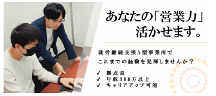 職種/仕事内容 | 仕事内容 障がい者向けの就労支援サービス『就労継続支援A型事業所』のマネージャーとして拠点運営をお任せします。 スタッフのマネジメントを中心に高いサービス提供をミッションとし、障がいのある方が活躍できる仕組みづくりをお願いします。 【具体的な仕事内容】 ・支援スタッフのマネジメント(10名程度) ー メンバーのモチベーション管理や教育(定期的な1on1の実施など) ・関係機関への営業・連携 ー 自治体や福祉団体、就業先になりうる企業などに挨拶まわり ・スタッフ及び障害のある方の採用業務 ー 支援員や利用者さまの面接対応 ー 新拠点スタッフの採用計画・育成計画などの立案 ・給付管理やサービス調整 ー 行政への請求業務 など <キャリアについて> 就労支援事業部で管理者への昇進はもちろん、あなたのやりたいを全力で応援します! 拠点長としてキャリアを目指すもよし、IT部門や管理部門へのジョブチェンジするもよし、あなたが目指したい道を選択できます。 <ポジションの魅力> ◎未経験からチャレンジできる! 全員が業界未経験スタートであり、入社後上司が拠点運用についてイチから指導をするのでチャレンジしやすいことが特徴です。 仕事を通して社会貢献性がダイレクトに感じられ、世の中のニーズも高い領域なので、やりがいが大きいです! ◎裁量が大きい! 現場を信頼して任せる風土が根付いているので決定権をもって業務を進めることが可能です。 また、信頼しているからといって「任せっきり放置」なんて事はなく、縦にも横にも斜めにも気軽に相談出来る様な、フォロー体制も整っております。 中長期的に100拠点オープンを目標としており、ポジションが豊富でキャリアアップできる機会が多数あります。 ◎ライフもワークも充実! 自分の人生を豊かにする手段として働いてほしいと考える当社では全従業員が働きやすい環境作りをおこなっています。 残業平均月10h未満、リフレッシュ休暇制度の導入はもちろん業界水準より高い給与設定をしています。 |