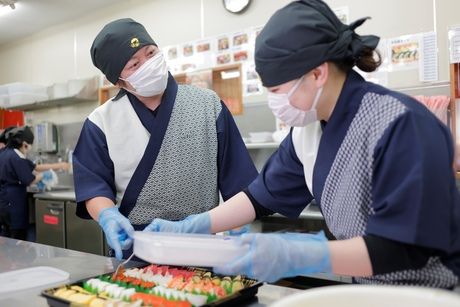 職種/仕事内容 | 仕事内容 カネキチにはうれしいメリットいっぱい☆あなたらしく働けます!気になったらお仕事内容をチェック! お寿司作りに難しい作業はありません。機械から出てきたシャリ玉を並べて、その上にネタを乗せます。巻物を切ったり、野菜を切ったり包丁を使うこともあります。レジはバーコードを読み取ったり、ボタンを“ピッ”と簡単です。 自分に合った働き方ができるから幅広い年齢のスタッフがイキイキ活躍しています! 接客が好きな方なら未経験でも大歓迎☆モクモクと一つの作業に取り組むことが得意な方にもオススメです!接客が苦手な方でも、接客業にチャレンジする第一歩になりますよ。学生、フリーター、主婦(夫)さん活躍中。高校生も大歓迎! バイトデビューも大歓迎!簡単なお仕事ばかりだから、スグ一人前になれます。 仕事内容は単純なものが多いのでご安心ください。先輩がしっかり教えます!ヤル気があれば巻寿司を巻いたりもできます。魚を切ったり包丁の使い方もイチから教えるので、私生活でも役立ちますよ。こんな仕事に興味がある方大歓迎です! 私たちと一緒に成長していきませんか?あなたのヤル気次第で様々なことにチャレンジできる環境です! 応募に必要なものは『ヤル気』『笑顔』『向上心』!それだけ!特別な知識や経験は必要ありません◎まずは元気なご挨拶からはじめましょう。「もっとここで腰を据えて頑張りたい!」という方には社員登用制度もご用意しています! 『お客様の喜びと満足』『社員の成長と幸せ』『会社の存続と発展』のために日々努力を重ねています。 株式会社カネキチは、『お持ち帰り寿司 カネキチ』を18店舗展開しています。安心でおいしいお寿司をご家庭でも気軽に食べていただきたい。その想いから新鮮なネタを安心の価格でご提供しています。様々なお客様のニーズにお応えできるよう、メニューも豊富に取り揃えております。 |