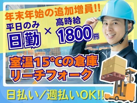 職種/仕事内容 | 仕事内容 ■おすすめポイント ○時給1800円~:月収32万円以上可 ○固定ワンシフト:9~18時のみ ○土日祝休みだからプライベートも充実! ○交通費支給ありなので安心♪ ○車通勤OK ○履歴書不要&Web面接OKなのでスピード面接・採用も可能! ○髪色自由/髪型自由 ○長期勤務できる方は歓迎! ______________ 年末年始の追加増員決定!!  ̄ ̄ ̄ ̄ ̄ ̄ ̄ ̄ ̄ ̄ ̄ ̄ ̄ ̄ \\ 3名以上の大募集! // 12月中に勤務スタートしたい方へのスピード採用も実施中です。 もしかしたら同期スタッフもいるかも◎ ■仕事内容 【平日のみのフォークリフトオペレーター】 ワインを扱う倉庫で、リーチフォークを使用した 入出荷作業をお願いします。 常に室温15℃程をキープした倉庫内での作業になりますので 一年中、季節関係なく適温で勤務いただけます。 フォーク作業の他、検品などの手元作業もあり。 フォークに乗りっぱなしではないので、 程よく気分転換をしながら作業を行えます◎ 様々なワインを見ることができるので ワイン好きな方にはたまらないお仕事です。 /////////////////////////////////////////////////// お電話での応募もOK!お気軽にお問合せください! 電話番号:0120-044-202 ◆問い合わせのみもOK /////////////////////////////////////////////////// ■リーチフォーク実働経験者は優先採用 リーチフォークの経験を活かしたい方にオススメ◎ 実務経験がある方は即戦力としてご活躍いただけます。 ブランクがある方もOK! 業務の流れはイチからしっかりお教えしますので、ご安心ください。 職場は和気あいあいとした雰囲気で、 20代・30代・40代の男性が多く活躍中です。 ■株式会社ノースについて 充実したサポート体制が魅力の当社。 デスクワークから、物流倉庫内まで幅広い業界のお仕事を取り揃えております。 ご希望条件を丁寧にお伺いし、最適なお仕事へのご案内とご相談に応じます。 就業中は担当者が派遣先とのパイプ役として定期的なサポートを行い、快適に働けるようにバックアップします。 |