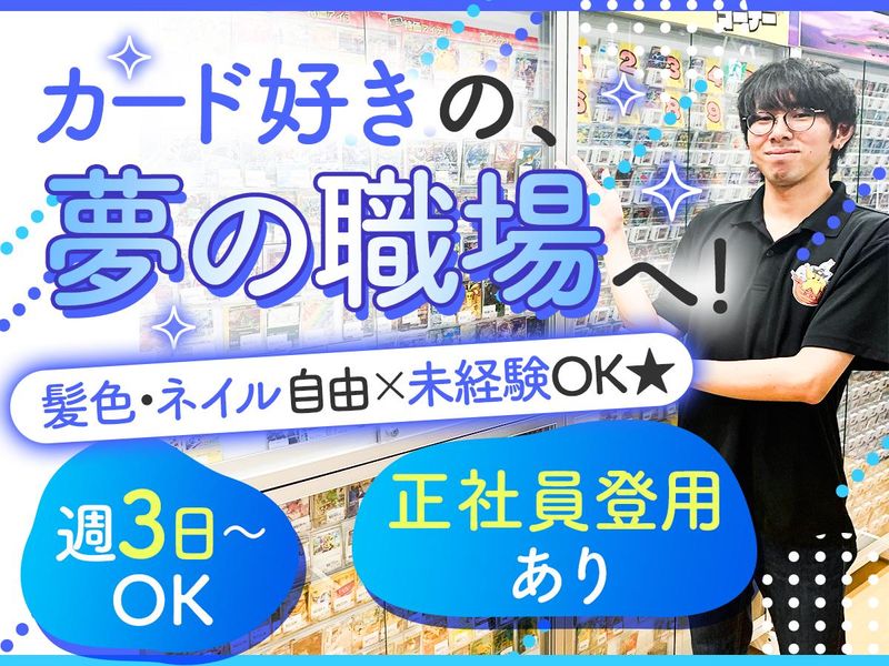 職種/仕事内容 | 仕事内容 岐阜羽島駅・新羽島駅徒歩5分★ トレーディングカードショップで接客・販売スタッフ募集! ■+高時給1200円~/未経験歓迎/週3日~・1日4h~/正社員登用あり/髪型自由・ネイルOK+■ ――――――――――――――――――..* \\ CHECK POINT // ★未経験OK!正社員デビューも目指せる ★週3日~・1日4h~無理なく働ける ★フリーター活躍中!副業・WワークもOK ★オシャレ自由♪髪型・髪色自由&ネイル・ピアスOK ★マイカー通勤OK!ストレスフリーで通勤できる 清潔感のある店舗&ドリンクバーも完備で 気持ちよく快適に働けます◎ 人柄重視の採用を実施しています! *..*..* 【業務内容】 『カードショップ海賊船-Starch-』にて 接客・販売などの店舗業務をお任せします。 >>具体的には ―――――――― ■カードショップでの接客・販売 ■レジ対応、商品陳列、在庫管理、店舗清掃 ■SNS更新・イベント運営(得意な方歓迎) 異業種からの転職者や未経験スタートのスタッフも多数活躍中! 業務の手順やコツは丁寧にレクチャーするので、 「カードが好き」その気持ちだけあれば未経験OK♪ >>どんなお店? ――――――――― いつもご利用いただくお客様からも 「清潔感があって良い」 「フリードリンクも充実しているから、過ごしやすい」 など、嬉しい声が届いています♪ ぜひ一度お店を見に来てください! >>正社員登用制度あり ―――――――――――― 高時給でモチベーション高く働けるのに加え、 好きなことで正社員になりたい方を応援中! 今年はすでに4名が正社員へとステップUPしており、 未経験入社の方もたくさん活躍しています。 「接客が楽しい」「カードに興味がある」 そんな理由での応募も大歓迎! あなたらしく成長していける環境です◎ *..*..* >>『マルチプル』とは? ――――――――――― 福岡県・山口県・東京都・岐阜県で カードショップの店舗を展開しています。 おかげさまで、年商1億円を突破!! 業績好調につきスタッフを増員募集します。 清潔&キレイなお店で働きたい方や 待遇が良い・やりがいのある環境で働きたい方も大歓迎◎ 右肩上がりの成長企業で、正社員を目指しませんか? |