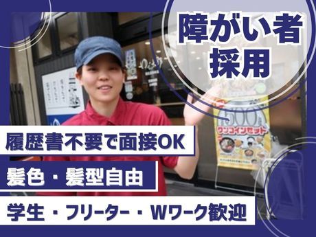 対象となる方 | 資格 ■障がい者手帳をお持ちの方 ■通勤可能な方 ――――――――――――――― ◇無資格OK ◇未経験者歓迎◇初心者歓迎 ◇経験者歓迎◇ブランクOK ★主婦・主夫歓迎 ★学生歓迎★フリーター歓迎 ○20代・30代・40代・50代・60代活躍中 ○ミドルや中高年活躍中 ○シニアも多数活躍中! ――――――――――――――― <<こんな方も歓迎します>> ○前向きに仕事に取り組める方 ○人と話すお仕事に挑戦したい方 ○飲食店勤務の経験がある方 ○長期勤務希望の方 ○英語が堪能な方 (外国人の来店もあります♪) ○家事の合間やお子さまのお迎えまでの時間を有効活用したい方 |