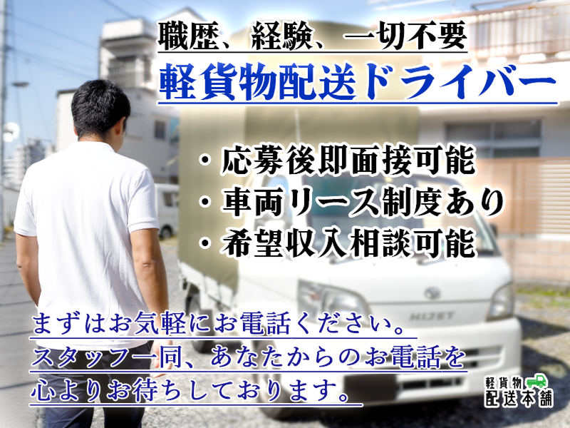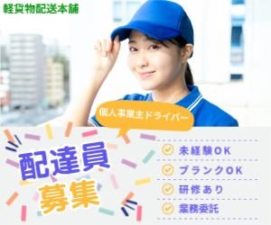 職種/仕事内容 | 仕事内容 軽自動車で配送センターに行き、荷物を積んで、家庭や企業へ届けます。 ①ネット通販商品の配送 ✅定期日時にて同じエリアをお任せするので、効率よく回れて安定して稼げます。 例えばその区域の1〜3丁目ほどの範囲を担当するので道はすぐに覚えられます! しかも重量物(飲料水、洗剤など)が無いため、気軽に働けます。 ✅各営業所にて研修も行うので未経験者も大歓迎です。 ②企業様専属便 ✅企業様の社内メール便や航空貨物、オフィス商品など案件豊富!こちらもルート配送なので安定、安心!! ③スポット便の配送 ✅24時間365日案件あり。突発的なお仕事や長距離など様々な案件があります!プラス@で稼ぎたいときに是非ご利用ください! 《給与》 ✅日売上1万8000円~ ✅その他の案件についてはお問合せください。 |
