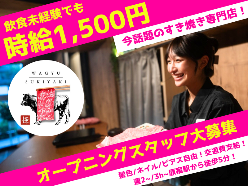 職種/仕事内容 | 仕事内容 // ⭐土日祝は嬉しい時給+100円⭐ \\ ■□日本の食文化を体験できる職場□■ ✅高単価で短時間の接客! ✅未経験でも安心のサポート体制◎ ✅おしゃれOK◎髪色・ネイル・ピアス自由 □■□□■□□■□□■□□■□□■□ 日本の食文化を体験できるすき焼き専門店✨ ホールとキッチンを兼任するスタッフを 募集しています♪ <具体的な仕事内容> □野菜のカットなどの簡単な仕込み作業 □ドリンクの作成 □食洗器あり □配膳、会計 ※調理は一切ありません✨ 店内はカウンターメインのタイプです◎ ぜひ、私たちと一緒に日本の食文化を世界に広めていきましょう♪ \WAGYU SUKIYAKI 極〜GOKU〜 Harajukuについて/ 脂の乗ったA5和牛サーロインのすき焼きを 1人1鍋のセルフ調理で味わえるすき焼き専店! 野菜や卵などの食材も新鮮なものを厳選しており、 〆には贅沢なトリュフ卵かけご飯をご提供! 店内はすき焼きをカジュアルに楽しめる雰囲気! 原宿、明治神宮前、北参道から徒歩圏内の場所にあります◎ 「明治神宮前」駅より徒歩4分/ 「原宿」駅徒歩7分/「北参道」駅徒歩12分 |