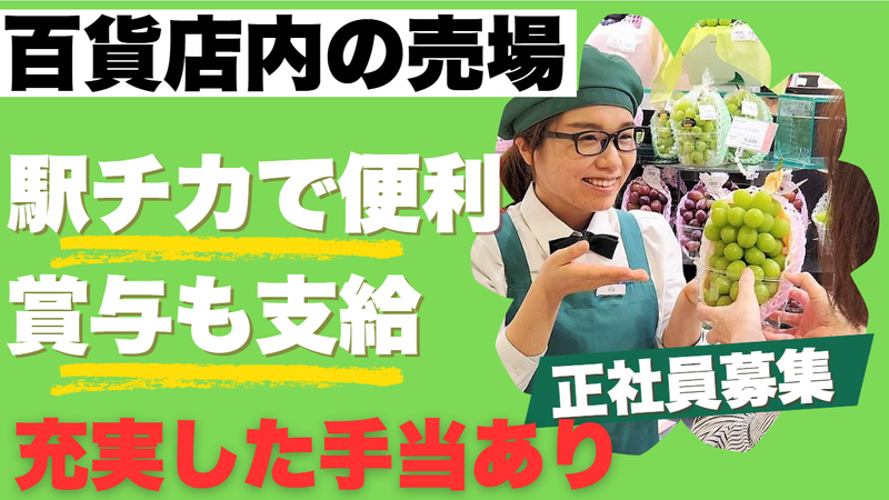 職種/仕事内容 | 仕事内容 阪急神戸店内の青果売場にて、 果物を中心とした贈答品の販売をお任せします。 お客様の用途やご希望を伺いながら、 商品をご案内する接客中心のお仕事です。 ▧ ▦ ▤ ▥ お任せする内容 ▧ ▦ ▤ ▥ ・果物や贈答用商品のご案内 ・会計業務 ・商品の陳列、補充 ・売場の整理整頓 ・そのほか販売に付随する業務全般 百貨店ならではの落ち着いた環境で、 一人ひとりのお客様と丁寧に向き合えます。 ✿ 未経験でも安心 ✿ 入社後は、百貨店での基本的な 決まりごとから学びます。 先輩と一緒に売場に立ちながら、 果物の知識や接客の流れを少しずつ 覚えていける環境です。 珍しい果物や、百貨店でしか扱わない商品も多く、 知識が増えるほど接客が楽しくなっていきます。 ✿ 長く働ける理由 ✿ ・勤続20年以上のスタッフも在籍 ┈┈┈┈┈┈┈┈┈┈┈┈┈┈┈┈┈┈ ・定年なしで、年齢を重ねても続けやすい ┈┈┈┈┈┈┈┈┈┈┈┈┈┈┈┈┈┈ ・女性スタッフも多数活躍中 ┈┈┈┈┈┈┈┈┈┈┈┈┈┈┈┈┈┈ 腰を据えて、安定して働きたい方に 選ばれています。 ✿ 将来について ✿ 販売経験を積んだ後は、 商品の仕入れを担当する担当者や、 売場責任者を目指すことも可能です。 一人ひとりのペースを大切にしています。 最後までお読みいただきありがとうございます。 少しでも気になった方は、ぜひご応募ください。 あなたとお会いできるのを楽しみにしております。 詳細はHPでも公開しています◎ https://sunfresh-group.com |
