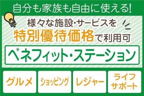 待遇・福利厚生 | 【保険制度】 雇用保険、労災保険、健康保険、厚生年金 【福利厚生】 待遇・福利厚生 【福利厚生】 ・社会保険完備 ・制服貸与 ・有給休暇 ・交通費全額支給 ・バイク通勤OK(ガソリン代補助) ・社員食堂あり(240円の定食あり) ・敷地内全面禁煙 ・結婚祝金、出産祝金、こども手当、入学祝金、退職金制度などの福利厚生が充実(規定) ・紹介キャンペーン ※ご紹介くださった方1名につき5万円を進呈(規定) 【ベネフィット・ステーションの利用が可能】 ベネフィット・ステーションとは、 様々なシーンでご利用いただける 総合型福利厚生サービスです。 映画鑑賞やホテルディナー、宿泊施設 などの余暇・レジャー関連をはじめ、 日常で使えるフィットネスや 育児・介護支援、ライフサポートなど 約140万件以上の幅広いメニューを お得な価格で利用できます。 <サービス例> ・全国40,000以上の宿泊施設 ・全国30,000店舗以上の飲食店 ・全国約7,700ヶ所のスポーツクラブ など スタッフさんはもちろん、ご家族の方もお好きなだけ利用できます。 |