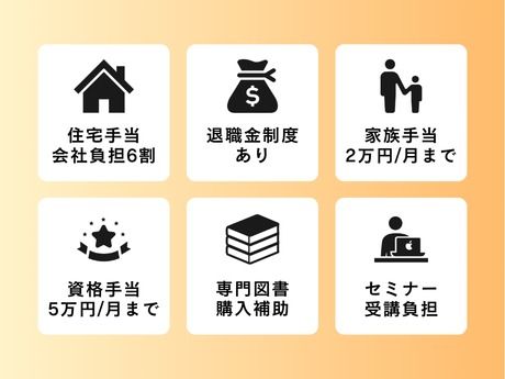 待遇・福利厚生 | 【保険制度】 雇用保険、労災保険、健康保険、厚生年金 【福利厚生】 待遇・福利厚生 【福利厚生】 【手当】 ◎各種手当:時間外・出張・資格・家族 L 資格手当5万円まで L 家族手当2万円まで L 赴任手当5万円まで L 帰省旅費手当 ◎通勤交通費支給(上限30,000円まで) L 公共交通機関使用の場合は、1ヶ月の定期代を支給 L 自家用車使用の場合は、距離数に応じて支給 ◎住宅手当:単身用・世帯用あり、当社が家賃+共益費の6割を負担、引越し費当社負担(規定あり) 例えば家賃が10万円の場合、月額6万円の補助額になり、年間72万円です。 手取額が増えるため大きなメリットです。 ◎加入保険:健康・厚生・雇用・労災 ◎昇給:年1回(前年度実績:1月あたり4,000円~25,000円) ◎賞与:年2回(前年度実績/計4.00ヵ月分/支給月:7月と12月) ◎定年60歳、再雇用65歳まで ◎退職金制度あり(勤続3年以上) ◎健康診断 ◎技術セミナー受講手当 ◎専門図書購入手当 ◎各種特別報奨金等 ◎レクリエーション活動 ◎技術交流会(年3回) ◎試用期間:6ヵ月(給与条件などの変動はございません) |
