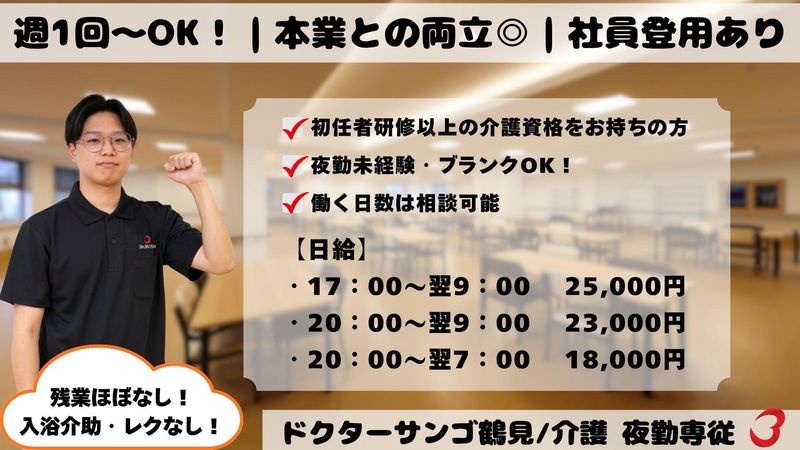 職種/仕事内容 | 仕事内容 ╭━━━━━━━━━━━━╮ 12月オープン! オープニング大募集!! ╰━━━v━━━━━━━━╯ ==================== ✨関西初のドクター在駐施設! ✨週1日から勤務OKの夜勤! ✨日給1万8000円~2万5000円★ ✨WワークOK!本業との両立◎ ==================== オープニングスタッフとして 新しいスタートを切る仲間だけの職場です。 上下関係や派閥は一切なし! みんなが同期だから、 遠慮なく意見を言い合える、 風通しの良い環境です。 【お仕事内容】  ̄ ̄V ̄ ̄ ̄ ̄ ̄ ̄ ̄ ̄ ̄ ̄ ̄ ̄ ̄ ̄ ̄ ̄ ̄ 住宅型有料老人ホームで、夜間の介護業務 全般をお願いします。 ✅入居者様の食事対応 └夕食・朝食の準備、食事介助、片付け。 ✅就寝・起床のサポート └着替え補助、口腔ケア、洗面介助など。 ✅移動の介助 └施設内の安全な移動をサポート。 ✅夜間の巡回 └定期的な巡回、ナースコール対応、 緊急時の初期対応。 ✅館内の掃除 └共用部の簡単な清掃や整理整頓。 ※食事の際は全員食堂へ集合します 【働きやすさのポイント】  ̄ ̄V ̄ ̄ ̄ ̄ ̄ ̄ ̄ ̄ ̄ ̄ ̄ ̄ ̄ ̄ ̄ ̄ ̄ ⏩選べる!シフトパターン ①17:00~翌9:00 ②20:00~翌9:00 ③20:00~翌7:00 ⏩週1日からOK!曜日は応相談 ⏩関西初のドクター在駐施設で働ける! ⇒平日9時~13時に 医師が施設にいるため、 緊急時や医療判断が必要な際に 迅速な対応が可能。 介護スタッフとして安心して 業務に取り組めます。 ⏩未経験の方も安心! ⇒先輩スタッフが丁寧にサポートします。 最初は先輩と同行し、まずは入居者様に ご挨拶。仕事の流れを徐々に覚えて いきます。わからないことがあれば、 いつでも先輩ヘルパーに相談できる 環境です◎ ⏩初任者研修以上の介護資格があればOK! ⇒介護の実務経験がない方や、ブランクが ある方も大歓迎です。 ゼロからチームを創る面白さ! 共に働く仲間と、最高の職場環境や 理想の介護サービスを一緒に 創り上げていく達成感を味わえます。 全員が同じスタートライン! 経験や年次に関わらず、 フラットな関係性で、 互いに助け合い、 高め合えるチームを目指します。 【施設について】  ̄ ̄V ̄ ̄ ̄ ̄ ̄ ̄ ̄ ̄ ̄ ̄ ̄ ̄ ̄ ̄ ̄ ̄ ̄ 「ドクターサンゴ 鶴見」は、住宅型 有料老人ホームとして入居者様の快適な 生活をサポートしています。 一般個室121室(トイレ付)を完備して おり、心地よく過ごせる環境づくりに 力を入れています。 |