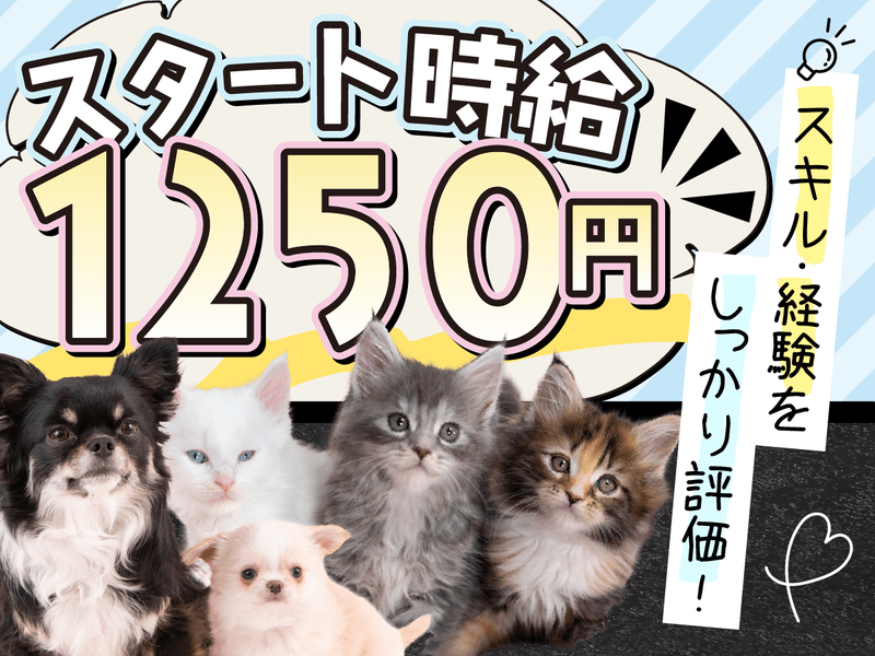職種/仕事内容 | 仕事内容 \日祝メインの勤務できる方大歓迎!/ トリミングサロン併設の ペットショップで、ワンちゃん・ ネコちゃんのカットやケアを行う トリマーのお仕事です✨ 経験を活かして働きたい方は もちろん、ブランクがある方も 安心してスタートできる環境です。 家庭やプライベートと両立しながら、 動物好きな仲間と一緒に楽しく 働けます。 ・。・。・。・。・。・。・。・。・。・・。・。・。・。・。・。・。・。・。・ ■主な業務内容 ・。・。・。・。・。・。・。・。・。・・。・。・。・。・。・。・。・。・。・ カット、シャンプー、ブロー、 爪切り、耳掃除、肛門腺しぼりなど、 犬・猫のトリミング全般を お任せします。 小型犬が中心で、1日あたり 3~5頭程度を担当。 ペットの健康状態をチェックしながら 丁寧に仕上げていきます。 店内では飼い主様との会話や 予約対応など、 コミュニケーションを大切にする お仕事です。 ・。・。・。・。・。・。・。・。・。・・。・。・。・。・。・。・。・。・。・ ■ブランクありでも安心! ・。・。・。・。・。・。・。・。・。・・。・。・。・。・。・。・。・。・。・ 久しぶりにハサミを握る方も ご安心ください。 まずはシャンプーや補助業務から スタートし、 徐々にカットをお任せします。 実務経験半年以上あれば 即戦力として活躍可能です。 ・。・。・。・。・。・。・。・。・。・・。・。・。・。・。・。・。・。・。・ ■資格・スキルをしっかり評価! ・。・。・。・。・。・。・。・。・。・・。・。・。・。・。・。・。・。・。・ JKC公認トリマーA級・B級などの 資格手当あり。 スキルに応じて時給も優遇されるため、 頑張りがしっかり お給料に反映されます。 「資格を取ってよかった」と 感じられる環境です。 ・。・。・。・。・。・。・。・。・。・・。・。・。・。・。・。・。・。・。・ ■柔軟シフトで無理なく勤務 ・。・。・。・。・。・。・。・。・。・・。・。・。・。・。・。・。・。・。・ 1日4時間~OK・週3日~勤務OK。 1ヶ月ごとのシフト申請制で 予定も立てやすく、 お子さんの学校行事や 家庭の都合もしっかり考慮します。 土日どちらか1日は必ず 出勤できる方を募集しています。 家庭と両立しながら 長く働ける職場です。 |