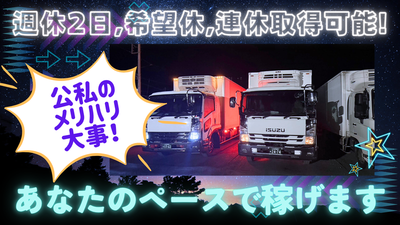 職種/仕事内容 | 仕事内容 *・。*・。*・。*・。*・。*・。*・。*・ 安定した働き方を実現! 「夜間に落ち着いて働きたい」 「決まったルートで無理なく続けたい」 そんなあなたにぴったりのお仕事です! *・。*・。*・。*・。*・。*・。*・。*・ ◆仕事内容  ̄ ̄ ̄ ̄ ̄ ̄ ̄ ̄ ̄ ̄ ̄ ̄ ̄ ̄ ̄ ̄ ̄ ̄ ̄ ̄ ・夜間専属! ・4tトラック(中型)での食品のルート配送 業務 ・1日1往復のシンプルな配送業務 ・長距離運転なし! ・手積み手降ろしなし! 一度道を覚えてしまえば難しいことはありません♪ 体力的な負担が少ないのが大きな魅力です♪ 【配送ルート】 佐野市出発 ↓ 茨城県小美玉市の食品工場へ納品 ↓ 佐野市へ戻る ◆働きやすさも抜群  ̄ ̄ ̄ ̄ ̄ ̄ ̄ ̄ ̄ ̄ ̄ ̄ ̄ ̄ ̄ ̄ ̄ ̄ ̄ ̄ 小美玉市の工場での約3時間の待機時間は、 あなたのための休憩時間です。 仮眠や食事、自由時間に活用できるので 夜間の仕事でも無理なく取り組めます。 ◆未経験の方も大歓迎  ̄ ̄ ̄ ̄ ̄ ̄ ̄ ̄ ̄ ̄ ̄ ̄ ̄ ̄ ̄ ̄ ̄ ̄ ̄ ̄ 未経験の方も大歓迎です。 入社後には、将来のキャリアアップを応援 する大型免許取得支援制度をご用意! 会社が費用を全額負担! あなたのやる気次第でどんどんスキル アップできる環境です♪ ◆快適な運転環境も望めるかも⁉  ̄ ̄ ̄ ̄ ̄ ̄ ̄ ̄ ̄ ̄ ̄ ̄ ̄ ̄ ̄ ̄ ̄ ̄ ̄ ̄ 業績好調につき大幅増車しました! もしかしたらピカピカの新車を運転できる かも? そんな希望も働く意欲を沸かせます! |