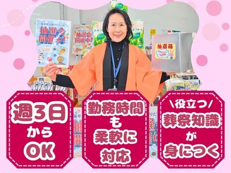 職種/仕事内容 | 仕事内容 \会員サービスのご案内をお任せします!/ ★午前・午後のみ、フルタイムなど選べる働き方★ ★週3日~OK!プライベート両立も可能です★ ★お仕事復帰も大歓迎♪子育て中の方も活躍中★ \一覧で見る仕事内容/ ・当社会員サービスのご案内 ・商業施設や郵便局での接客 ・自社の商品説明や契約手続き \POINTをサクっと紹介/ 中高年を中心に需要が高い会員サービスで、 かつ安価であるため 無理なくご案内できるので安心です! たとえば… 「業界・業種経験が無い」 「仕事復帰やブランクがあって不安」 「子供が小さいので仕事時間を選びたい」 そんな悩みがある方は 是非、最後までご覧ください! -★ 仕事内容について ★- ―――――――――――――――――― 郵便局やスーパー等の商業施設で、地域住民の方に 「終活の年代別意識調査」にご協力いただきます。 話題の終活についてお客様の関心や不安な事などを 親身になってお伺いし併せて当社の会員サービスを ご案内します。 ご案内する商品は葬祭会員サービスです。 入会金9000円という業界破格の金額で、 最近需要が高まっている家族葬にピッタリの商品! 事前知識は丁寧にサポート! 接客経験があればバッチリ! 【一日の流れ(例)】 9:00~ 現場(郵便局など)に集合 事前にセッティングされたブースで スタート準備を行います。 9:10~ 活動開始 来店された方に、意識調査と 会員サービスのご案内を行います。 12:00~ お昼休憩 13:00~ 午後の活動開始 17:00~ 接客ブースの片付け(重労働はナシ) 17:30~ 結果の報告・翌日の引継ぎをして退勤 -★ 勤務シフトについて ★- ―――――――――――――――――― ・1日4時間~◎ ・週3日~◎ ・1ヵ月の希望シフト制 ・日曜定休♪ 午前のみ/午後のみOK ・家庭都合の急なお休みもOK! 家庭と両立したい方や小さいお子様が居る方も 安心してシフトを組む事ができます! もちろん、フルタイムでしっかり働きたい方も 大歓迎の柔軟なシフト体制です! -★ 研修内容について ★- ―――――――――――――――――― 当社会員サービス・業界知識の研修や OJTなどを行い、基本スキルをしっかり 身につけてからの安心スタート! 1.当社会員サービスや社内知識についての研修 ―――――――――――――――――― 現場デビュー前に、当社の沿革や サービス内容についての研修を行います。 1対1でスタッフが丁寧に指導するので 葬儀に詳しくなくても安心です! (講習自体は1週間程度で終わります) 2.OJT訓練 ―――――――――――――――――― 研修で基礎知識を学んだら 先輩同行で現場デビュー! OJTを通じて、ノウハウを学んで頂きます。 何かあっても、常駐のサポートスタッフが 手厚くフォローします! 盤石な体制のもと、独り立ちまでに 必要なスキルをしっかり習得可能! -★ 職場環境について ★- ―――――――――――――――――― 職場復帰の主婦パートさんやフリーターさん 中高年・シニアの方と 幅広い年代の方が活躍されています♪ 事務所にはサポートスタッフが駐在しており 業務中の困りごとはすぐに解決可能! 職場デビュー後も、先輩や同僚と一緒に活動する 機会が多い為、安心です。 -★ 当社について ★- ―――――――――――――――――― 当社はこれまで55年以上、地域に密着して ご葬儀のお手伝いをさせて頂いてきました。 需要の安定した業界のため長く安定して 働ける環境が整っています。 【募集背景】 業務拡大によるスタッフの増員募集です! 【この仕事のメリット】 他の職種では得られない専門知識が身に付きます。 葬祭知識は人生において役立つため、 大満足のスタッフが多数! 真面目な方が実を結ぶため コツコツとした努力が得意な方には 是非、オススメしたいお仕事です! |