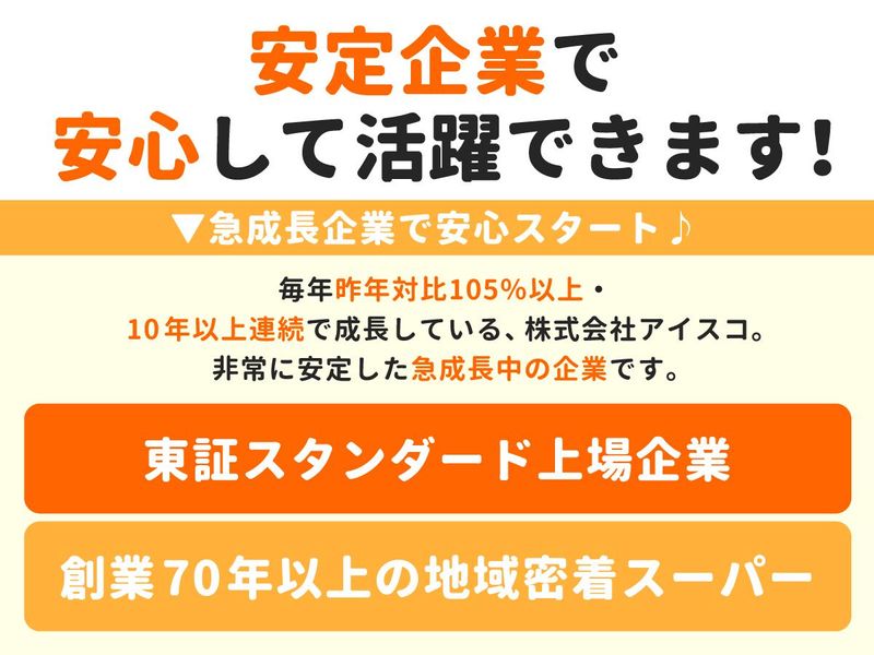 職場環境・雰囲気 | 職場環境 地域に根差したスーパーとして親しまれている一方で 今までの体制にとらわれず現場の声や変化に柔軟に対応しています。 若手スタッフの意見も積極的に取り入れ働きやすさや業務効率を常にアップデート◎ 未経験の方もチャレンジできる、安心して仕事を始められる環境です。 喫煙所:喫煙所あり(屋外) |