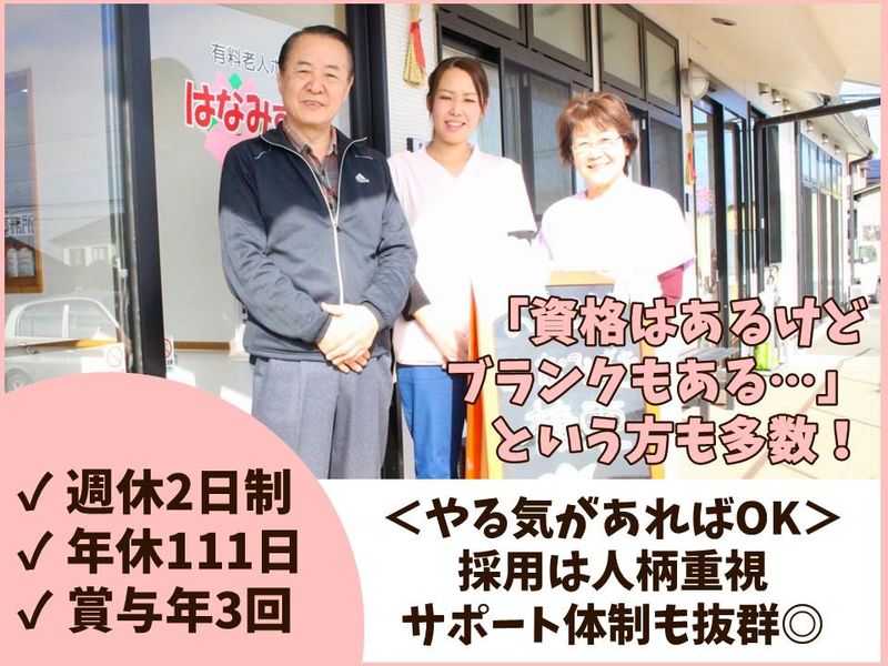職種/仕事内容 | 仕事内容 30~50代まで幅広い年代の方が活躍中! <定着率抜群>サポート体制もバッチリ ==================== 《仕事内容》 *介護業務全般 *介護日誌などの記録業務 ※夜勤あり(月に4~5回) 《具体的には…》 食事・排泄・入浴介助などを基本とする 入居様のお世話をお任せします。 はなみずき榛東内の 有料老人ホームでの勤務です。 (デイサービスへのヘルプも稀にあります) ==================== 《有料老人ホームはなみずき榛東》 「人に優しく思いやりを持って働ける方」 「丁寧に仕事ができる方」など、 たくさんの方とお会いできることを 楽しみにしています。 「資格はあるけどブランクがある」 というスタッフも多数活躍中! 代表も積極的に現場へ出ていますから、 困った時はいつでも相談してくださいね。 《ホームページ》 http://hanamizuki-shinto.com/ |