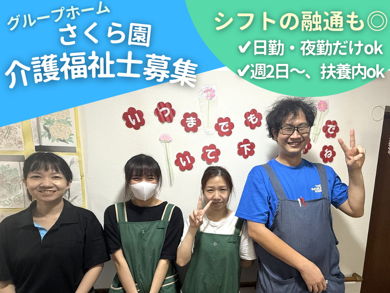 職種/仕事内容 | 仕事内容 =求人のポイント= *介護福祉士スタッフ大募集! *週2日~勤務OK!無理なく働きやすい♪ *日勤のみ・夜勤のみ、短時間も相談可 *面接前の職場見学OK! 【仕事内容】 定員18名のグループホームにて 食事や入浴の介助、お部屋の清掃などの 生活支援業務をお任せします。 【職場環境】 現在は40代~50代の約20名が活躍中! 家事と両立しながらシフトで働く方や 子育てがひと段落してフルで働く方など 自分に合った働き方を実現させています。 【研修について】 ブランクのある方も大歓迎です! OJTを通して段階を踏みながら サポートしますのでご安心ください! 【HP】 https://www.reiwakaigo.co.jp/facility/sakura/ |