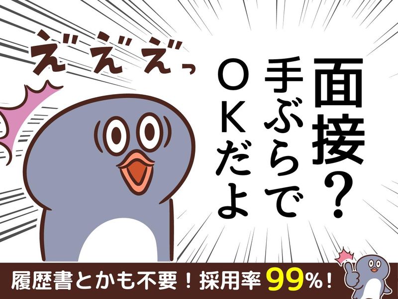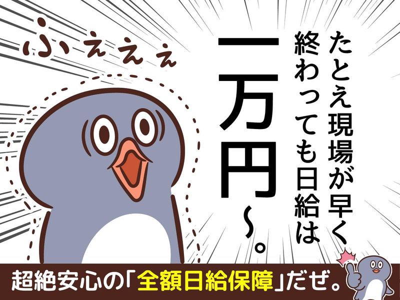 職種/仕事内容 | 仕事内容 ★-★ オドロキの高収入を手軽に実現 ★-★ 1現場につき日給は1万円~です。 ※夜勤の場合は1万2000円~! ここからがすごいんです。 各現場は基本8時間ですが、予定時間よりも早く終わることもあります。その場合でも、日給は満額支給!!「日給全額保障」っていうウチで超人気のシステムなんです。 しかもしかも、希望によっては1日に複数現場をまわることもできます。 つまり… 1日2現場(日勤+夜勤)をまわれば日収2万2000円~。 3現場(日勤+日勤+夜勤)なら日収3万2000円~!! こんなに効率よく稼げる仕事、 あんまりないと思います(笑)。 ★-★ さらにさらに… ★-★ お給料は月払いだけじゃなくて、「日払い」「週払い」も選べちゃいます。日払いなら当日に全額手渡し!翌日なら振込も可能です。 ※週払い・月払いの場合も手渡しor振込を選べます。 ごめんなさい。まだまだあります。週3日~勤務OK!短期・単発もOK!長期でじっくりももちろん熱烈歓迎!レギュラーで入ればめっちゃめちゃ稼げます! 入社祝金もあり!しかも10・万・円!※規定あり ★-★ 個室寮(しかも新築)も完備! ★-★ TVや冷蔵庫、洗濯機などの家電はもちろん、布団やWi-Fiといった生活に必要な「全て」が揃ってます!新生活をスタートさせたい方にも、最高の環境です! ★-★ 具体的なお仕事内容 ★-★ 様々なイベントにおける設営・撤去・警備の仕事です。軽作業が多く、難しくありません。 ★-★ 面接に履歴書は不要! ★-★ 手ぶらでお越しください。ちなみに、採用率は実に99%!未経験の方もご心配なく。合格者には初出勤後、面接時の交通費も支給します。 ★-★ 選考だってスピーディー! ★-★ ご来社いただいて、面接・説明は30分程度!合格すれば翌日からさっそく勤務スタート可♪ |