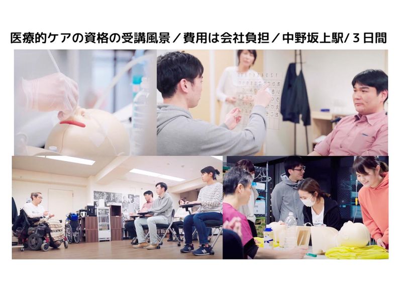 待遇・福利厚生 | 【保険制度】 雇用保険、労災保険、健康保険、厚生年金 【福利厚生】 待遇・福利厚生 【福利厚生】 ・社会保険完備(勤務日数による) ・賠償責任補償、労災保険あり ・退職金あり(規定有) ・正社員登用あり ・資格取得支援あり ・服装自由 ・髪型自由 ・副業・WワークOK ・育児・介護休業者復職支援制度 ・定期健康診断 ・受動喫煙対策あり(屋内禁煙) 【試用期間について】 1ヶ月 ※通常時給1200円~/深夜帯時給1500円~ ※所持資格・サービス案件により研修3~7回あり(1~4週間) 【アクセスについて】 事業所:「東陽町駅」徒歩1分 ・錦糸町駅 ・亀戸駅 ・住吉駅 ・西大島駅 ・東大島駅 ・門前仲町駅 ・木場駅 ・南砂町駅 ・森下駅 ・清澄白河駅 など ※京葉線、総武線、東西線、半蔵門線、都営新宿線、都営大江戸線、有楽町線、りんかい線など 【資格取得支援あり】 ・重度訪問介護従事者 ・介護職員初任者研修 ・介護福祉士実務者研修 など 基本、受講費は会社全額補助。 自己負担0円で一生モノの資格を 手に入れられます!(規定有) 【研修について】 ・同行研修(現場同行研修) ・入社時研修(座学講座) ・ジョブメドレーアカデミー動画研修(スマートフォン等でのオンライン研修) ・毎月の職員会議内での研修 ・担当利用者宅での実地研修(医療的ケア対象) ・資格受講費用全額キャッシュバック制度(規定有) ※他、入社後数ヶ月間は週1回、リモートミーティングにより困りごとの相談や利用者情報の共有を必要に応じて随時行っております |