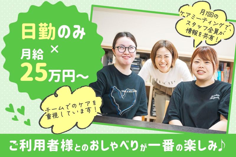 職場環境・雰囲気 | 職場環境 ★温かい雰囲気の地域密着型施設です! 大正時代に建てられた大きな一軒家を リノベーションして開設した当施設。 地域の方々にも親しまれる 賑やかで楽しい場所で、 女性スタッフが中心に社員4名、 アルバイト7名が活躍中です。 喫煙所:喫煙所あり(屋外) |