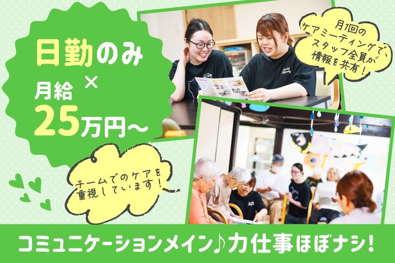 職種/仕事内容 | 仕事内容 \ 経験者も安心!働きやすい職場です / ・日勤専属!規則正しい生活リズムが叶う ・身体介助少なめ!ムリなく続けられる ・手厚い研修と資格取得支援あり! さらなるスキルアップも可能 ――* 具体的な業務内容 *―― ◆介護業務 └見守りや軽度の食事 入浴・排泄介助などが中心 ◆利用者様の送迎 └運転が得意な方にぜひ! ◆レクリエーションの企画・運営 └おやつ作りや歌、頭の体操など ◆生活相談員業務 └利用者様やご家族のサポート ―・○・―・●・―・・―・●・―・○・― 【 1日の流れ(例) 】 *08:00 利用者様のご自宅へ伺い、施設へ送迎 *09:00 午前のレクリエーション (頭の体操や音楽など)/入浴サポート *12:00 昼食 *14:00 午後のレクリエーション (おやつ作りやゲームなど)/書類作成 *15:00 おやつタイム *17:00 余暇活動後、随時送迎 ◎夕食後までの延長利用可能 ◎系列施設の宿泊利用可 など ご家族の想いに応えるサービスも提供! ―――* 働きやすさの秘密 *――― \充実した教育体制であなたをサポート!/ 入社後3ヶ月間を目安に、 トレーナーがしっかり指導します。 座学研修もあり、基本的な考え方や 業務の進め方を丁寧に共有します。 ※業務についてのハンドブックも完備! ★資格取得支援制度あり 介護福祉士などの資格取得に 必要な費用を会社が全額補助! 経験者のスキルアップを応援します。 ★月1回のケアミーティング 利用者様一人ひとりのケア方針を 全体で確認するミーティングを実施。 チームで支え合う体制が整っています。 ★定期的な社内研修 介護・福祉知識を学べる勉強会を 社内で定期的に提供しています。 経験者も安心してスキルを磨けますよ! \気になる方はぜひ施設見学へ!/ スタッフや利用者様の雰囲気を 実際に見ていただくことが可能です。 「どんな職場なのか自分の目で確かめたい」 そんな方は、ぜひお問い合わせください! |