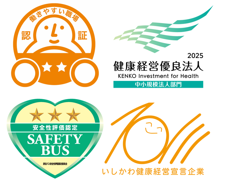 待遇・福利厚生 | 【保険制度】 雇用保険、労災保険、健康保険、厚生年金 【福利厚生】 待遇・福利厚生 【福利厚生】 【✨充実した福利厚生✨】 ・定期健康診断(年2回) ・人間ドック ・脳ドック ・睡眠時無呼吸症候群 スクリーニング検査 ・永年勤続表彰制度 ・無事故表彰制度 ・社員寮 ・サークル活動(走友会、野球、 バレーボール、フットサルなど) ・社員割引制度 【手当】 ・通勤手当 ・時間外手当 ・休日手当 ・深夜手当 ・精勤手当 ほか ・賞与あり(年2回) 【その他制度】 ⭐安心のサポート体制⭐ └ 運行管理者やベテランドライバーが常にサポート └ 緊急時対応マニュアル完備 ✅資格取得支援✅ └ AT限定解除支援 └ 大型二種免許取得支援制度 ✅転職支援金制度✅ └ 2025年4月から転職支援金制度を設定しております。 ※詳細は面接時にご説明いたします。 ✅各種認定✅ └ 弊社は働き方や安全性に関する複数の認定 (石川県、経産省、国交省等)を受けております。 |