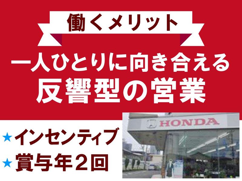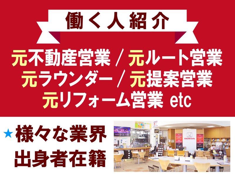 職種/仕事内容 | 仕事内容 ホンダカーズの正規ディーラーとして 1975年に設立して50年、 所沢の皆様に長年愛されてきました。 今回は、1人1人のお客様としっかり 向き合ってくださる営業職を募集いたします。 保険などの販売手続きや 購入後のアフターフォローまでを行う 営業の仕事です! 【具体的には】 新車を購入しにきたお客様にご案内をし、 お客様に合った車を販売するお仕事です。 また購入時のローンの説明、 車検の案内、各種保険などの 販売手続き、提案、 購入後のアフターフォローまでを 行う営業もして頂きます。 ご来店される方は もともと車へ興味のある方がほとんど。 販売後のアフターフォローは 新型車やモデルチェンジご案内の電話や DM送付、車輌コンディション維持の ためのメンテナンスの案内など 入社後はHonda Carsの業務フローに 慣れていただきますが、 商談・提案はこれまでの ご経験を活かして早期にお任せします。 お客様が希望する車輌のご案内はもちろん、 生活シチュエーションに合わせて どんな車やオプションがオススメか、 ローンの組み方をどうするかなど、 様々なご提案をします。 購入時の自動車保険や定期点検、 車検の手続きも行うのは自分。 また定期点検やメンテナンスに モデルチェンジの案内など アフターフォローも大切な仕事です。 そういった1つ1つの仕事がお客様の喜びに繋がり、 信頼関係を築いていけます。 反響営業だから準備をしてしっかり お話しできるのも魅力の1つ。 転勤もないのでお客様とは 長いお付き合いができます。 |