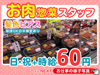 職種/仕事内容 | 仕事内容 主婦やシニア世代の方が多数在籍中 食肉の部門で販売している「肉バルレストラン」の商品を作るお仕事です。 研修期間は先輩従業員が付いて仕事を教えてくれるのでご安心ください 先輩従業員も未経験から始めた方が多いです。皆さん丁寧に教えますので徐々に慣れていってください。 調理のスキルは必要としていませんので、普段料理をしない方でも全く問題ありません ■主なお仕事内容 1.角煮、からあげ、焼き鳥の調理 ラルズの肉部門で取り扱うお惣菜の調理を行います。マニュアルの手順で調理を行うので誰でも簡単に調理をすることが出来ます。 2.お肉屋さんの弁当作り 肉屋の「豚丼」「鶏天丼」「角煮カレー」などお弁当の調理を行います。 3.パック詰め商品化、品出し 出来上がった商品をパックに詰めて値段を貼り、売り場に並べます。 ■ラルズはこんな職場 ・20代~60代の様々な幅広い年代の方が在籍中 ・スタッフのほとんどが未経験出身で在籍中です ・子育て中の方や主婦・主夫さん・シニア世代も在籍中 ・働く時間は短時間や扶養の範囲内の勤務もOK。 ・ダブルワーク、フリーター、お仕事のブランクある方も活躍しています。 |