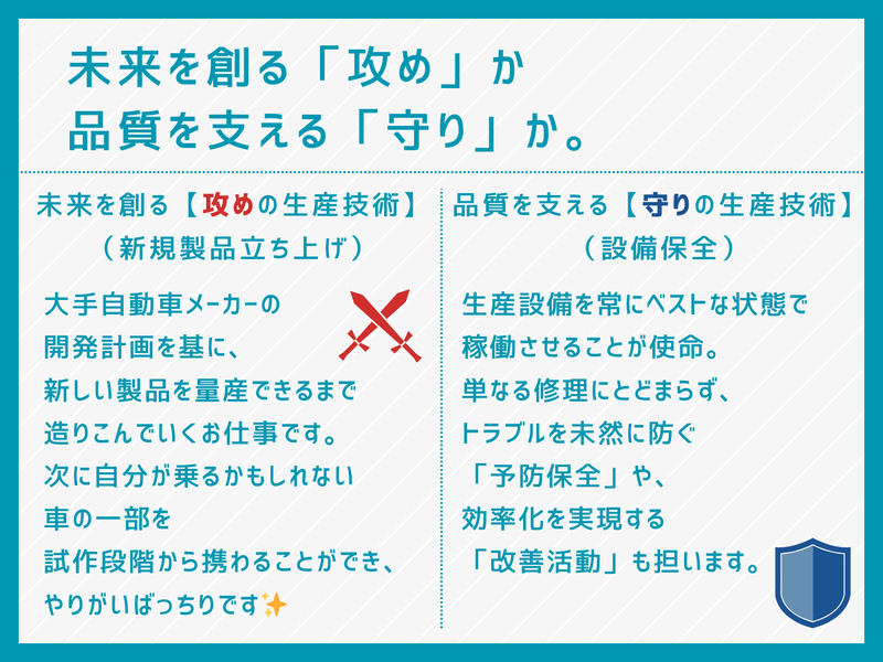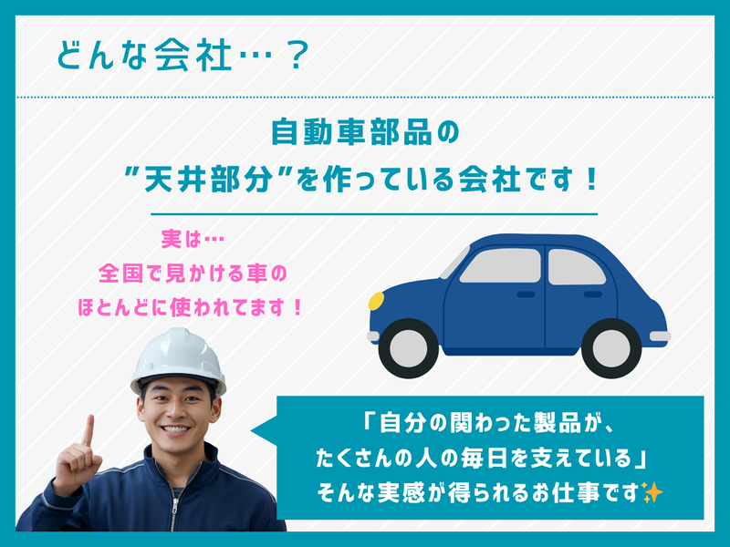 職種/仕事内容 | 仕事内容 ✨株式会社HOWAグループ✨ 大手自動車メーカーと安定取引! 経験者が納得できる厚待遇でお迎えします◎ \⭐この求人のおすすめポイント!⭐/ ………………………………………………… ★生産技術経験者が“納得”できる好条件 ★生産技術未経験でもOK! ★大手自動車メーカーと安定取引 ★年間休日121日!プライベートも大切に◎ ★「攻め」(新規製品立ち上げ)と 「守り」(設備保全)の分業制 ★土日休み・長期連休あり ★入社3か月で有給3日付与✨ ★厚待遇で安心して働ける環境! ★嬉しい賞与5.4か月分♪ 自動車産業が「100年に一度の変革期」を迎える中、 HOWA岐阜の生産現場も日々進化を続けています。 私たちの強みは、未来のクルマをゼロから生み出す 【攻めの生産技術(新規製品立ち上げと量産製品の工程改善)】と、 安定した生産環境を維持する 【守りの生産技術(設備保全)】の二本柱。 盤石な“守り”があるからこそ、 安心して未来への挑戦=“攻め”ができる。 今回は、この両輪をさらに強化するための増員募集です。 あなたの経験と志向に合わせて、 キャリアを選んでみませんか? ■あなたはどちらのプロを選ぶ? ┈┈┈┈┈┈┈┈┈┈┈┈┈┈┈┈•• ①未来を創る【攻めの生産技術】 大手自動車メーカーの開発計画を基に、 新しい製品を量産できるまで 造りこんでいくお仕事です。 次に自分が乗るかもしれない車の一部分を 試作段階から携わることができ、 やりがいばっちりです✨ 〈主なお仕事内容〉 ・新製品の生産方式(工程レイアウト)を構築 ・生産設備の調整 ・設備の導入、据付、調整 ・品質・生産性を目標値まで高めるための改善業務 ②品質を支える【守りの生産技術】 生産設備を常にベストな状態で稼働させることが使命。 単なる修理にとどまらず、 トラブルを未然に防ぐ「予防保全」や、 効率化を実現する「改善活動」も担います。 〈主なお仕事内容〉 ・生産設備の定期メンテナンス、予防保全計画の立案・実行 ・突発的な設備トラブルの原因究明と再発防止策の策定 ・生産性向上のための設備改善、治具の設計・製作 ・新規設備の導入サポート(攻めの部署との連携) ⭐希望・適性に合わせてキャリア選択可能! 途中でのジョブチェンジも柔軟に相談できます。 ■経験者なら気になる… 生産技術ならではのお悩み Q&A! ┈┈┈┈┈┈┈┈┈┈┈┈┈┈┈┈•• Q:毎日ルーティンで、 新しい技術に触れる機会が少ない… A:次世代自動車に対応した最新技術に携われます。 将来的にはマネジメントだけでなく、 専門職として技術を極める道も! ────────── Q:成果を出しても 「当たり前」と思われてしまうのでは? A:当社では評価制度を明確に整備。 コスト削減や生産性向上の成果は、 きちんと評価に反映されます ────────── Q:突発トラブルで 休日や夜間に呼び出されることが多いのでは? A:新規設備導入時を除き、 基本的にほとんどありません。 計画的な生産体制だから、 プライベートも大切にできます。 ────────── Q:自動車業界の将来性が心配… A:HOWAグループとして 国内外の大手メーカーと安定取引。 変革期だからこそ、 新しいモノづくりに挑戦できる環境です。 ────────── Q:経験が浅くてもやっていける?(第二新卒) A:OJTを通じて先輩が丁寧にフォロー。 基礎を固めながら段階的にスキルを磨けます。 ────────── Q:攻め(立ち上げ)か守り(保全)、 どちらかしか選べない? A:適性や希望に応じて選択OK! キャリア途中でのチェンジも 柔軟に相談できます◎ ■HOWA岐阜について ┈┈┈┈┈┈┈┈┈┈┈┈┈┈┈┈•• 株式会社HOWAのグループ会社で、 国内6工場のひとつ。 クルマの内側から「快適な空間」を生み出す会社です。 国内トップシェアを誇る天井製品をはじめ、 トヨタ・ダイハツ・ホンダ・三菱など 大手メーカー車に搭載される内装部品を生産しています。 「自分の関わった製品が、 たくさんの人の毎日を支えている」 そんな実感が得られるお仕事です✨ ■働き方と制度 ┈┈┈┈┈┈┈┈┈┈┈┈┈┈┈┈•• 各種手当が充実しており、 年間休日も多く、 ワークライフバランスが整っています! ライフスタイルに合わせて 働きやすさ抜群◎ また、入社3か月で有給は3日付与。 入社半年でさらに9日付与され、 合計12日に! 入社1年後からはなんと… 20日の有給付与がされるんです! お子さんの授業参観や プライベートの予定など、 きちんと希望に応じて 取得できる環境です◎ ムリなく働けるから、 長く続けやすいんですよ✨ ■最後に… ┈┈┈┈┈┈┈┈┈┈┈┈┈┈┈┈•• モノづくりの未来を拓く「攻め」か、 安定したモノづくりを支える「守り」か。 あなたの経験と志向に合わせて、 次のキャリアを選びませんか?✨ |