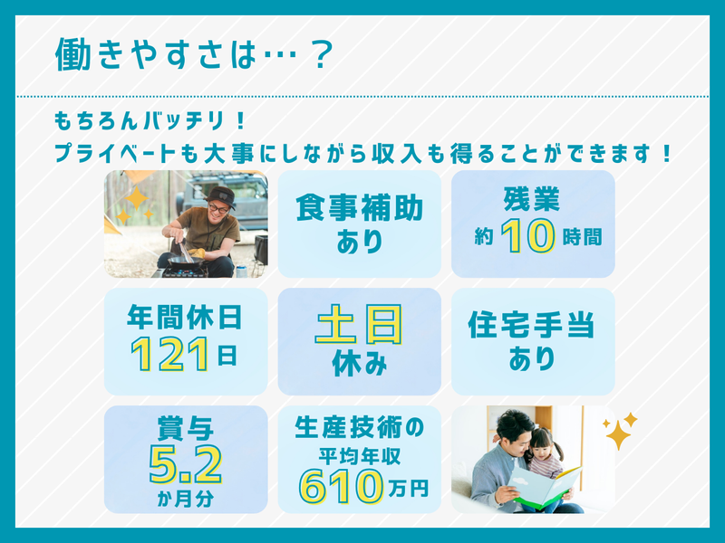 対象となる方 | 求めている人材 ⭐20代・30代活躍中⭐ 〈必須条件〉 ・高卒以上 〈こんな方も大歓迎です!〉 ・生産技術または 設備保全の経験をお持ちの方 ※年数・業界は問いません ※第二新卒や経験の浅い方もOK◎ ・自動車業界での経験がある方 ・安定した業界で長く働きたい方 ・しっかり稼ぎたい方 ・地元でのお仕事を考えている方 ・やりがいある仕事をしたい方 ・モノづくりの仕事に携わりたい方 ・協調性を持ってチームで働ける方 ・新しい技術に触れてスキルアップしたい方 〈こんな方にオススメ✨〉 ①未来を創る【攻めの生産技術】は… ・ゼロから何かを創り出すことにワクワクする方 ・常に新しい技術や工法に触れていたい方 ・関係者を巻き込み、プロジェクトを推進するのが得意な方 ────────── ②品質を支える【守りの生産技術】は… ・物事を深く探求し、原因を突き止めるのが好きな方 ・安定した生産を縁の下で支えることにやりがいを感じる方 ・既存の仕組みをより良く改善していくのが得意な方 〈実際のスタッフの声〉 ■技術を極められる環境です/20代男性 前職でも機械いじりは好きでしたが、 当社では最新設備に触れながら、 ゼロから生産の立ち上げに関われるのが魅力です。 経験を積むごとに、 自分の成長を実感できてやりがい抜群です✨ ────────── ■安定と家族の時間を両立/30代男性 突発的なトラブル対応が少なく、年間休日も多め。 残業も少なめなので、家族と過ごす時間が増えました。 さらに賞与5.2か月分で、家庭の経済的な安心感もUP! パパとして、家族を支えられるのが嬉しいです✨ ────────── ■経験を活かしてキャリアアップ/40代男性 前職では設備保全の経験がありましたが、 HOWA岐阜では改善提案や新規導入サポートなど、 より幅広く活躍できています。 経験を評価してくれる社風なので、 自信を持って取り組めますし、 今も日々学びがあり充実しています✨ このように、20代の若手から 30代・40代のベテランパパさんまで、 幅広く活躍しています◎ HOWA岐阜では、経験やスキルをしっかり評価し、 「安心して長く働ける環境」と「納得の待遇」をご用意しています。 あなたのこれまでの経験を最大限に活かせる、 最後の職場にふさわしい環境です。 少しでも興味があれば、ぜひご応募ください!✨ |