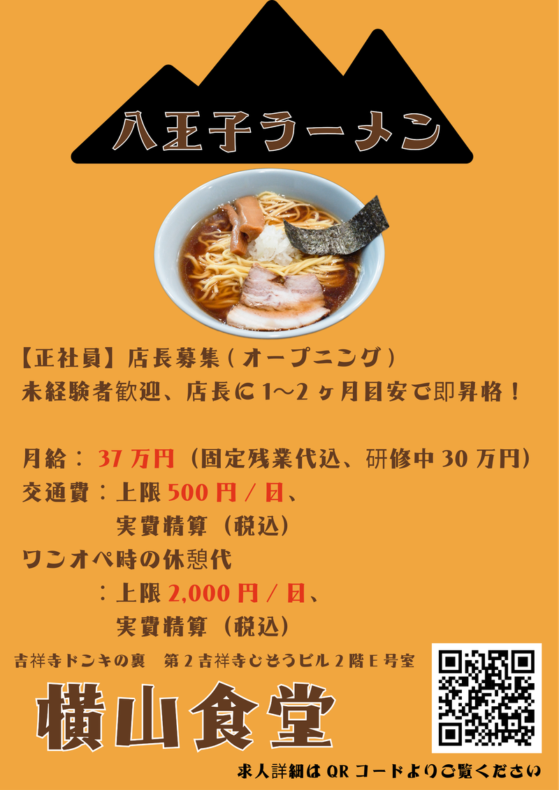 勤務地 | 八王子ラーメン横山食堂 吉祥寺店 180-0003東京都武蔵野市吉祥寺南町1-9-11第2吉祥寺じぞうビル2階E号室 勤務地 転居を伴わない転勤あり。ただし、複数店舗出店までは転勤なし。 ※出向があります 出向先企業名:他飲食店を買収した際は出向の可能性あり。当面はなし。 |