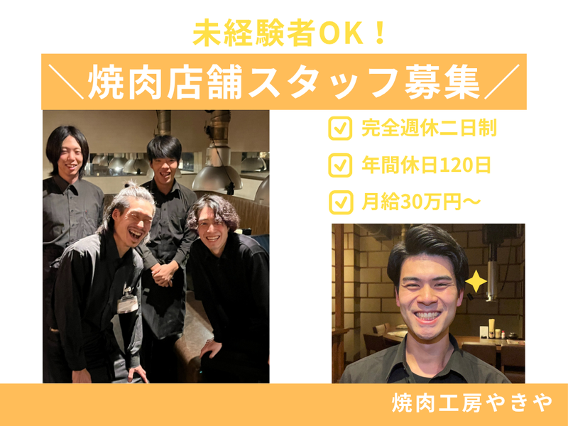 職種/仕事内容 | 仕事内容 ✨年間休日120日 ✨完全週休二日制 ✨未経験でも30万円スタート ✨特別休暇多数ご用意! 「接客の仕事は好きだけど、 将来を考えると給与が上がりにくい…」 「お休みが不規則で、 プライベートの予定が立てづらい…」 そんな悩みを持つあなたへ。 その「人当たりの良さ」や「素敵な笑顔」、 『焼肉工房やきや』で活かしませんか? 私たちが目指すのは、 “笑顔があふれる店舗づくり”。 調理スキルや飲食の経験は一切問いません。 お客様をパッと明るい気持ちにできるような 「第一印象」と「素直な人柄」を活かして、 ぜひ当店で活躍してみませんか? あなたからのご応募お待ちしております♪ ⭐「やきや」が選ばれる3つの理由 ┈┈┈┈┈┈┈┈┈┈┈┈┈┈┈┈┈•• ✅ 頑張りを収入で還元! 月給30万円~ 「頑張りを正当に評価したい」という想いから、 未経験の方でも月給30万円以上を保証します。 実際に、20代社員の平均月収は約32.8万円。 さらに賞与年2回、資格手当や歩合給もあり、 あなたの「笑顔」や「気配り」が、 しっかりと収入に反映される環境です! ✅ 飲食店なのに「年間休日120日」! 「飲食店=休みが少ない」そんなイメージを覆します。 私たちは、プライベートの充実が 仕事のパフォーマンスにつながると信じています。 ・完全週休2日制(シフト制) ・年間休日120日 ・誕生日休暇、記念日休暇 ・春休み、秋休み ・自由取得型長期休暇制度 など… お休みがしっかり取れるから、 メリハリをつけて働けます。 ※23時までの営業のため、帰宅は少し遅くなりますが、 その分、お休みと給与でしっかり応えます! ✅ あなたの「接客経験」が活きる場所 単なる接客ではなく、 「また〇〇さんに会いに来たよ」 とお客様に言っていただけるような 温かい空間づくりを重視しています。 ⭐お任せするお仕事 ┈┈┈┈┈┈┈┈┈┈┈┈┈┈┈┈┈•• 予約管理からお客様のご要望のヒアリングまで、 店舗運営の核となるポジションをお任せします。 【具体的には…】 ・お客様のご案内 ・オーダー取り ・料理やドリンクの配膳 ・お会計、お見送り ・カンタンな調理補助、仕込み など… 慣れてきたら、シフト作成やアルバイト指導、 商品開発、飲食店運営に関する業務もお任せします◎ あなたのペースに合わせて丁寧に教えますのでご安心ください。 ⭐当店について ┈┈┈┈┈┈┈┈┈┈┈┈┈┈┈┈┈•• 『焼肉工房やきや』は、 お客様の笑顔はもちろん、 スタッフが「楽しく輝きながら働ける」 会社を目指しています。 「第一印象8割」を掲げ、 経験よりも「素直さ」や「人当たりの良さ」 を正当に評価。 仲間と力を合わせ、 お客様も自分自身も笑顔になれるお店で 一緒に働いてみませんか? |