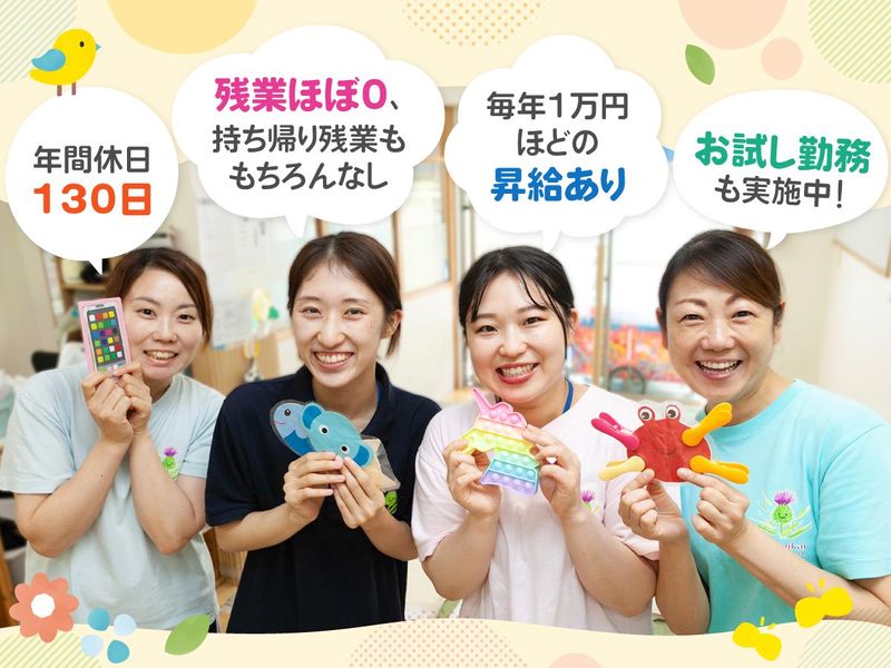 職種/仕事内容 | 仕事内容 \\⚓ここが違うぞ!「あざみ会」⚓// ✅年間休日【130日】確保!! 土日祝のほかにも夏季・年末年始 結婚休暇・子供看護休暇なんて制度も! 安心して休めるうれしいポイントです ✅【残業なし!】多くても月30分! もちろん、持ち帰り残業もなし。 規定以上の人員を常時配置することで 事務作業・制作作業に充てる時間を 定時内で確保できます ✅【フリー保育士】制度導入 お休みがとりやすく、残業がない理由は この「フリー保育士制度」のおかげ。 どのクラスにも属さない、 お助け専門スタッフ! クラスをフリー保育士に任せている間に 休憩や事務作業の時間を確保! ✅【昇給・賞与】あり 昇給→年1回/毎年5000円~1万円ほど 賞与→年3回/6月・12月・3月に支給 ✅【お試し勤務】可能!! 1日の勤務からOKで最長3日まで可能! 現場での勤務が久しぶりの方や 経験が浅い方はぜひ実際の雰囲気を見て 応募するか否か決めてみてください! →お電話やメールから お気軽にお問合せください✨ ――――――――――――――― お問合せはお気軽に♪ →電話☎ 03-6433-1477(採用担当) 受付時間/平日 9:30 ~ 18:00 →メール✉ 115-kawanishi@azamikai.or.jp(採用担当) 担当者より確認させていただき ご連絡を差し上げます! ※営業電話など営業のご連絡はお控え下さい。 ――――――――――――――― ========= ⭐お仕事内容⭐ ========= ■保育業務全般 (0~5歳児) ・子どもたちの食事や着替えなどのお世話 ・年間行事の企画/実施 ・書類作成 ・保護者対応(連絡や相談など) ⭐1日のスケジュール例⭐ ■午前 近くの公園までお散歩! 粘土やブロックで遊んだりします。 ■給食~午後 フリー保育士と交代しながら お昼寝や自由遊びなど♪ ✅「自然に触れながら五感の発達を促進させる」の理念のもと 子どもたちの感受性を育むために、 園外保育や様々な行事・教室にも注力しております。 職員発案の企画を実行することもあり、 年間を通して様々な体験を用意します。 行事が多いと準備に時間がかかって 残業や持ち帰り仕事が多発しそう… こんな心配事が生まれますよね。 あざみ会では行事の準備や 制作物などの準備時間もすべて勤務時間に入れられるよう 業務時間の調整を行っております。 残業時間・持ち帰り残業は年間を通して 月に0分から多くても30分ほど。 ほとんどのスタッフが定時きっかりに退社します。 ⭐入社後について⭐ 今までのご経験内容やご経験年数によって異なりますが 基本的にはOJT形式で先輩保育士から 日常の保育や制作物の作成方法などをお教えいたします。 わからないことがあれば すぐに聞ける先輩スタッフが近くにおりますので 気軽に聞ける環境が整っています。 以下具体的な 入社後の流れの一例となります。 ~入社後1ヶ月程度~ 園のこと、設備やルールについての 説明を受けながら、 0歳~5歳すべてのクラスをまわり OJT形式で業務に携わります。 ~2ヶ月目~ 担当するクラスを先輩と一緒にみていきます。 ~3ヶ月目~ 一通りの業務の流れが掴めていればOK! 分からないことは周りの先輩がフォロー しますので徐々に独り立ちできるように業務を覚えていきます! 未経験の方や経験の浅い方は ビジネスマナー研修や 電話対応の方法から学び 徐々にできることから スタートしていただきます◎ ※ピアノに自信がなくても大丈夫です◎ ======== ⭐POINT⭐ ======== ✅職員の労働保全に注力! ★年間休日130日 ★完全週休2日制 ★ 長期休暇取得可能! 様々な休暇制度をご用意! ✅残業はゼロ! 国が定めているよりも、 さらに厳しい東京の基準の 1.8倍の保育士の割合を確保しています。 そのため、十分な職員数が確保しており、 さらにフリーの保育士制度を 導入しているので 1人当たりの仕事量を定量化でき、 残業をなくすことが可能となっています。 担任の先生が職員室で作業するときは フリーの先生がクラスを見てくれています。 だから時間内に日誌や準備作業が終わり、 持ち帰り仕事も一切ナシ! その他、有給等でも担任の仕事を交代してくれるので、 遠慮せずお休みを申請できるのも魅力です♪ ✅昇給や手当・福利厚生が充実! 職員は毎年必ず5千円~1万円昇給します! 昇給表は全員に公開されており、その条件も明確。 スキルに応じて一気にランクアップする先生もいます! また、宿舎借り上げ制度や 役職手当、各種お祝い金など手当も充実しています。 ✅経験やスキルに応じて 将来的なキャリアアップも可能! 3~5年目を目安にグループリーダー 5~7年目を目安にクラスリーダー 10~15年目には保育士リーダー、 その後主任というように 将来を見据えたキャリアステップもご用意しています! ================== ⭐社会福祉法人あざみ会について⭐ ~職員全員の働きやすい 職場づくりを大切にする保育園~ *認可保育園を運営* 「定時退社」と「有給100%消化」を目指して 『TOKYO 働きやすい福祉の職場宣言』に登録しています。 今から55年前、一般企業の労働組合に所属する女性が中心となって 創設された保育園。 労働組合出身