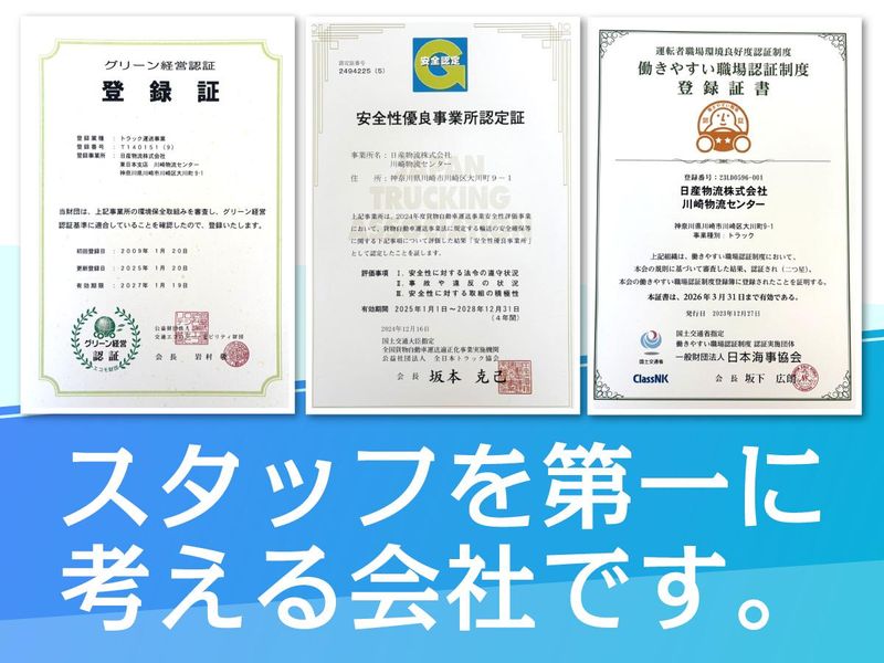 職種/仕事内容 | 仕事内容 \\今年で設立100年!// ⏩老舗企業で安定収入 ⏩完全週休2日制 ⏩年間休日125日 ⏩有給休暇あり ドライバーの気持ち 安全を第一に優先する社風! 少数精鋭のメンバーですが、 スタッフ全体の雰囲気がまるく 毎日が賑やかです。 仕事に対しては 「やる時はやる!緩めるところは緩める」 というスタンスなので、 仕事とプライベートのどちらも 大切にしながら メリハリを持って働けます! ////////////////////////////////////////// 【具体的な仕事内容】 関東圏内で高圧ガスなどの化学品配送をお任せします。 給油ホースを使って製品を汲んでいくので、 重たい手積み・手降ろしは一切ナシ! 体への負担が少なく、過去には 女性ドライバーも活躍していました♪ ※配送エリア 近距離:関東一円(1都5県) 長距離:富山県、福島県 ※長距離配送は月に1~2回程度 ////////////////////////////////////////// 【こんな応募理由が増えています!】 ▼最近の応募者からは、こんなお声をいただいています。 「夜勤が続いて、体力的に限界だった…」 「毎回の手積み・手降ろしが本当にきつかった」 「そんな時にここの仕事内容を見て、“朝は早いけど、これならやれそうかも”と思えたんです」 ⇒ そんな方にこそ、当社の働き方を知っていただきたいです! 【働き方の魅力】 出社が朝早い分、たっぷりと午後に 自由時間が取れるので、家族と過ごす時間が 増えたという声もあります。 土日祝休み&毎日家に帰れるルートだから、 家庭を支えながら働くパパさんドライバーも 多数在籍! 平均勤続年数は22年と、 職場環境の良さが数字にも表れています◎ - 働きやすさだけでなく、 スタッフが頑張った分は必ず還元する ところも魅力のひとつ! ✅残業代は別途全額支給 ✅賞与年2回(6月・12月)で合計50万円以上支給◎ 元ドライバーの所長が運営しているから、 現場スタッフの気持ちをしっかり くみ取ってくれます。 『会社の売上に大きく貢献してくれている ドライバーには、手厚くしてあげたい』 そんな思いから待遇・福利厚生を積極的に 整えているんです。 「急に車が動かなくなった…」 なんてトラブルがあった時も、 親会社から保証料が支給! 様々な面から、ドライバー達の生活を 保障いたします◎ - 【入社日が選べます!】 1月21日 or 2月21日 入社希望の方大歓迎! 「すぐ働きたい」 「少し準備してからスタートしたい」 どちらの希望にも対応しています◎ - 【ドライバー第一の運営を心掛けています】 安全性優良事業所認定 Gマーク制度 取得 グリーン経営認証制度 取得 働きやすい職場認証制度2つ星 取得 - 【面接について】 服装は自由です! 涼しくて動きやすい格好でお越しください。 かしこまらず、お互いのことを知る時間に できたら嬉しいです◎ |