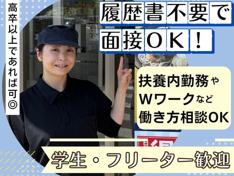 対象となる方 | 資格 【必須条件】 高卒以上 ――――――――――― ◇未経験者歓迎 ◇初心者OK・無資格OK ◇経験者歓迎・ブランクOK ◇学生歓迎 ◇主婦・主夫歓迎◇フリーター歓迎 ◇英語が堪能な方も大歓迎 …外国人観光客の来店もあるため <こんな方歓迎!> ●コミュニケーションをとることが好きな方 ●長く安定して働きたい方 ●チームワークを大切にできる方 <こんな方活躍中> ●子育てが落ち着いて復帰した方 ●家事の合間やお子さまのお迎えまでの時間を有効活用したい方 ●スキマバイトなどから安定勤務希望で転職した方 ●カフェや居酒屋、レストランなど飲食店勤務経験者 ●事務職や営業職、物流業、清掃業などの異業種からの転職者 20代・30代の若手から 40代・50代の中高年・ミドルまで 幅広い世代のスタッフが活躍中! |