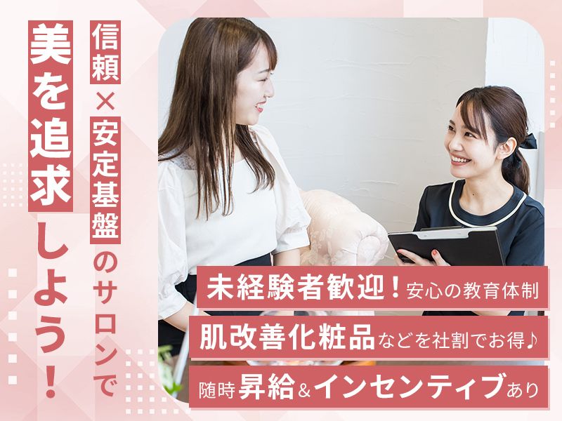 職種/仕事内容 | 仕事内容 *✧×✧**✧×✧**✧×✧**✧×✧* キレイも夢もぜんぶ叶えよう! 未経験から”美”のプロへ♪ *✧×✧**✧×✧**✧×✧**✧×✧* \\この求人の魅力ポイント// ☑ 受け継がれた技術力を学べる ☑ 未経験者歓迎!安心の教育体制 ☑ 月9日休みのシフト制で柔軟に勤務 ☑ 肌改善化粧品や最新美容機器など社割でお得! ☑ 随時昇給&インセンティブあり ☑ 住宅手当や交通費支給など充実 ☑ 全日本全身美容業協同組合 加盟店です ‥*お仕事内容はコチラ*‥ お客様の美と健康をトータルサポートする 美容サロンスタッフを募集! 施術からカウンセリングまでを担当します! ▼具体的には… ・フェイシャル(メイン)・ボディ・脱毛などの施術 ・お客様のカウンセリングと アフターフォロー ・美容・健康に関するアドバイス ・店内美化・準備、備品管理 ・売上管理や簡単なPC入力業務 ‥*未経験でもこれで安心*‥ ・専属の教育担当がマンツーマンで指導 ・自社セミナーでの体系的なカリキュラム ・一般常識や接客マナーも丁寧に指導 ・実技や知識ともに万全のフォロー体制 ⇒未経験からでもプロとして活躍できます! ゆくゆくは… カウンセラー→チーフ→主任→店長と キャリアアップも可能です! |