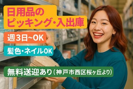 職種/仕事内容 | 仕事内容 日用品のピッキング・仕分け(服飾雑貨メイン)♪ コツコツ進めるシンプル作業♪未経験スタート多数! <お仕事内容> ・服飾雑貨・衣料品などのピッキング ・棚からの出庫・仕分け作業 ・バーコード読取、数量チェックなどのカンタン検品 未経験の方も始めやすい内容です。 【ここがポイント】 ◎未経験歓迎 └マニュアル&レクチャーあり。最初は先輩がしっかりサポート ◎働き方の自由度 └週3日~OK/フルタイムも歓迎 ◎職場環境 └清潔で明るい倉庫、女性スタッフ多数在籍 ◎おしゃれもOK └髪色・ネイルOK ◎アクセス安心 └送迎バスあり(神戸市西区桜ヶ丘より) |