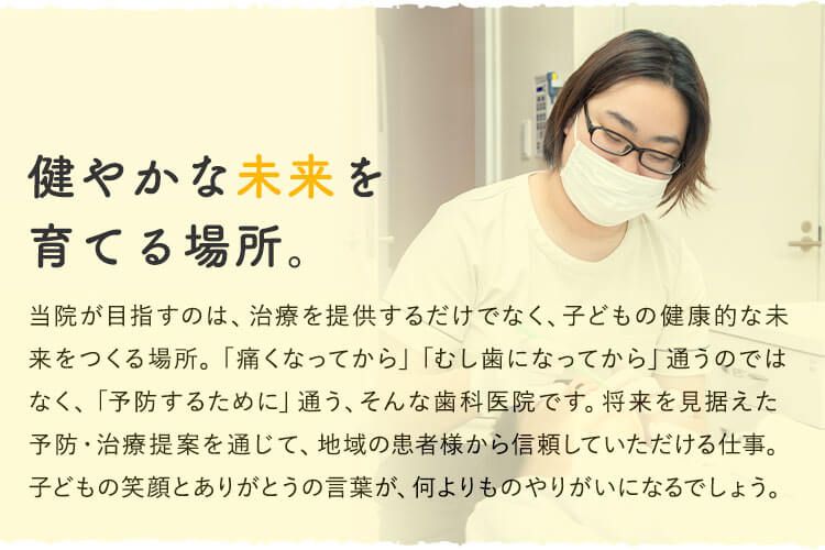 職種/仕事内容 | 仕事内容 ━━━━━━━━━ 保険診療メイン 子どもたちに向き合える 歯科衛生士ライフを。 やりがい・シフト調整 実務未経験OK! ━━━━━━━━━ この求人のPOINT 【やりがい】保険診療がメイン 【融通】週2日~OK!家庭・ほかの仕事と両立! 【続けやすさ】育産休制度&取得実績アリ くろだこども歯科・矯正歯科では、【歯科衛生士】を募集中。 『小児歯科・矯正歯科に特化』した、 『保険診療がメイン』の歯科医院です。 【 仕事内容 】 歯科予防処置/歯科診療の補助/歯科保健指導などの歯科衛生士業務のほか、矯正アシスト、その他予約管理などの受付業務もおまかせします。 メインは歯科衛生士業務ですが、患者様のお顔を覚えてもらうため、 受付関連業務もお願いしています。 実務未経験の方も応募OK!わからないことは、いつでも先輩スタッフに聞いてください。 |