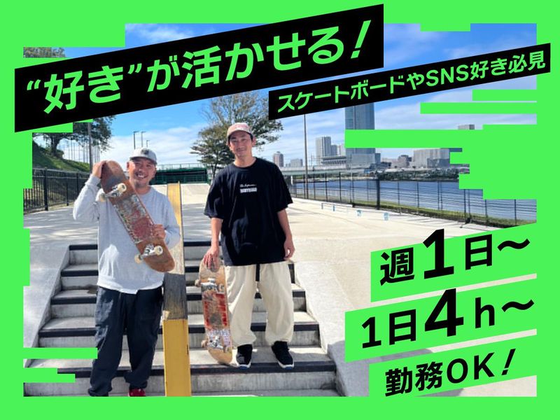 職種/仕事内容 | 仕事内容 ◆スケボー好きは特に歓迎! ◆週1日・1日4h~勤務OK! ◆男女ともに活躍中の職場です! ================ スケートボードが好きな方や 興味がある方は必見のオシゴト! ▼お仕事詳細 ・受付 ・施設内の清掃 ・SNS投稿 など 業務の流れは1つずつ丁寧に 説明するので未経験でも安心! |