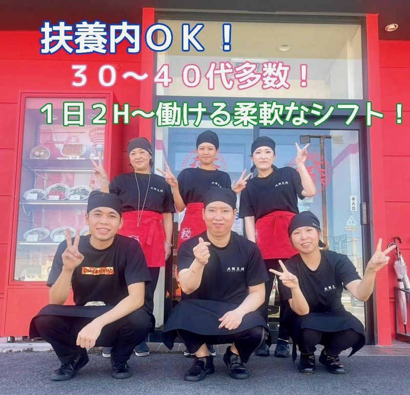 職種/仕事内容 | 仕事内容 20~50代の幅広い世代のスタッフ、 \\子育て世代の主婦(夫)さん活躍中// 未経験OK! 地元でスキマ時間を使って働きたい…! お子さんが学校に行っている間の 勤務もOK◎ ✅週1日~/2時間からOK◎ ✅扶養内勤務OK! 無理なく働いていただけます♪ ✅2週間毎の申請で柔軟なシフト対応◎ お子さんの急な体調不良などの相談も 遠慮なく! 「困った時はお互い様」が合言葉です★ ✅無料駐車場あり! 車・バイク・自転車通勤OK! 仕事終わりの買い物へも行きやすい♪ ●とにかくシフトの柔軟性が魅力ポイント♪ ━━━━━━━━━━━━━━━━━━━━ 今週は忙しいから週1日で、来週は余裕があるから週3日で頑張りたい! 他にも、急な出費や長期休暇があるからこの時期だけ出勤増やしたいな… そんな働き方の希望も遠慮なく都度ご相談ください◎ お小遣いを増やしたり家計のお助けなど、プライベートも大切にしていただけます。 ※週の総労働時間等条件により社会保険へ加入が必要となる場合がありますので、 その際には事前にシフトのご相談をさせていただきます。 大阪王将知立店では常に余裕を持った人員でシフトを組んでいるので、 一人でホールを回さないといけない…。という事は一切ありません。 急にシフトが入れなくなってしまった日は、 みんなで助け合って仕事をしているので、 団結力・仲の良さには自信があります!!✨ ベトナムや中国などさまざまな国の方もスタッフとして働いています! アルバイトを機に外国人の仲間とのコミュニケーションをとることもできますよ◎ <主なお仕事内容> ━━━━━━━━━━━━ ・ご来店されたお客様のご案内 ・お冷出し ・ハンディでの注文取り ・配膳や片付け ・レジ業務など ご注文を伺ったら、ハンディに入力するだけ! 慣れるまでは先輩が隣について仕事を教えます! いきなり1人で注文をとりにいくことはありません。不安なことは何でも聞いてくださいね! - 【嬉しいPOINTたくさん!】 *居酒屋のような飲み放題メニューなどはないので、 家族連れの方が落ち着いて過ごせる空間であなたらしく働けます! *中華料理店って油まみれ…?と思われがちですが、 スタッフ自身が居心地の良い空間作りも心がけているので、清潔感も大切にしています◎ *嬉しいまかないあり!ふわとろ天津飯が無料で食べられます! *勤務終了後に至近のサウナが利用できる!お隣に温浴施設があるので、一生懸命働いた後にスグに汗を流せます! *髪色自由! - 【働く仲間について】 *20代10名、30代4名、40代3名、50代2名のスタッフが働いています! *3年以上働いているスタッフが9名!腰を据えて長く働ける環境です◎ - 【スタッフの声】 このお店で働いてよかったと思うことはスタッフの人柄の良さとチームワークの良さです。 みんな仲が良いので、職場の人間関係に悩んだ事はありません! 仕事終わりにみんなで色々と話すのが毎日の楽しみだったりします。 また子供の体調不良で急なお休みがあっても困った時はお互い様!とスタッフ同士で協力しています。 - |